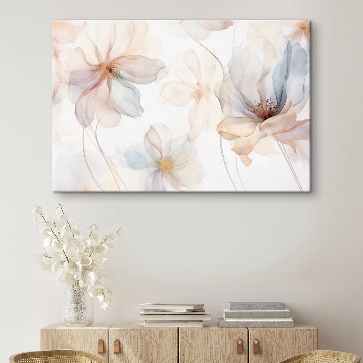 Cuadros Flores de textura translúcida en colores pastel, pétalos delicados, líneas delicadas sobre fondo blanco Nr s44855