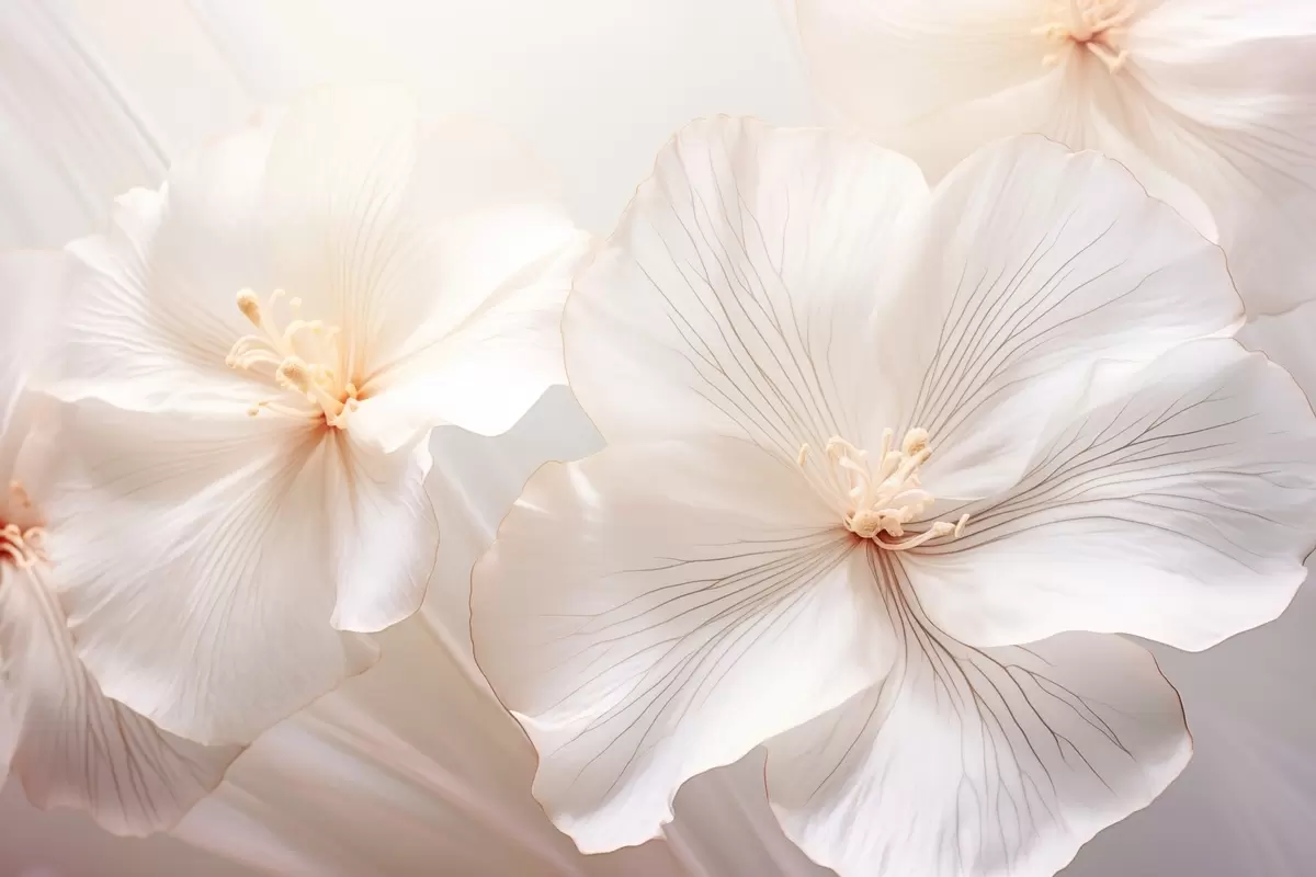 murales de pared Delicadas flores blancas con pétalos y centros de suaves colores pastel, que crean un arte floral de ensueño y etéreo s44858