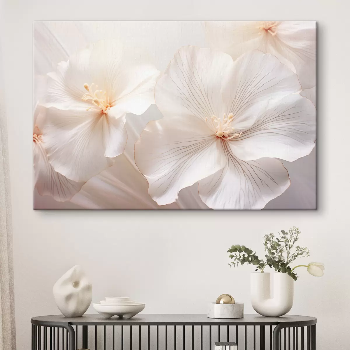 Cuadros Delicadas flores blancas con pétalos y centros de suaves colores pastel, que crean un arte floral de ensueño y etéreo Nr s44858