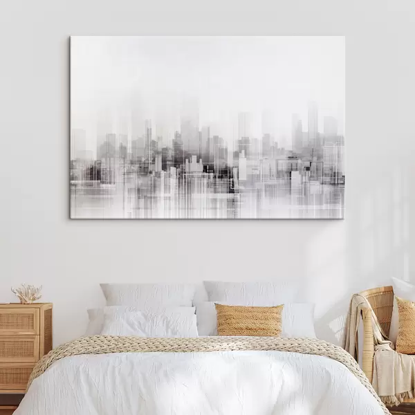 Cuadros Paisaje urbano minimalista texturizado con edificios altos y rascacielos, silueteados contra un cielo blanco Nr s44863