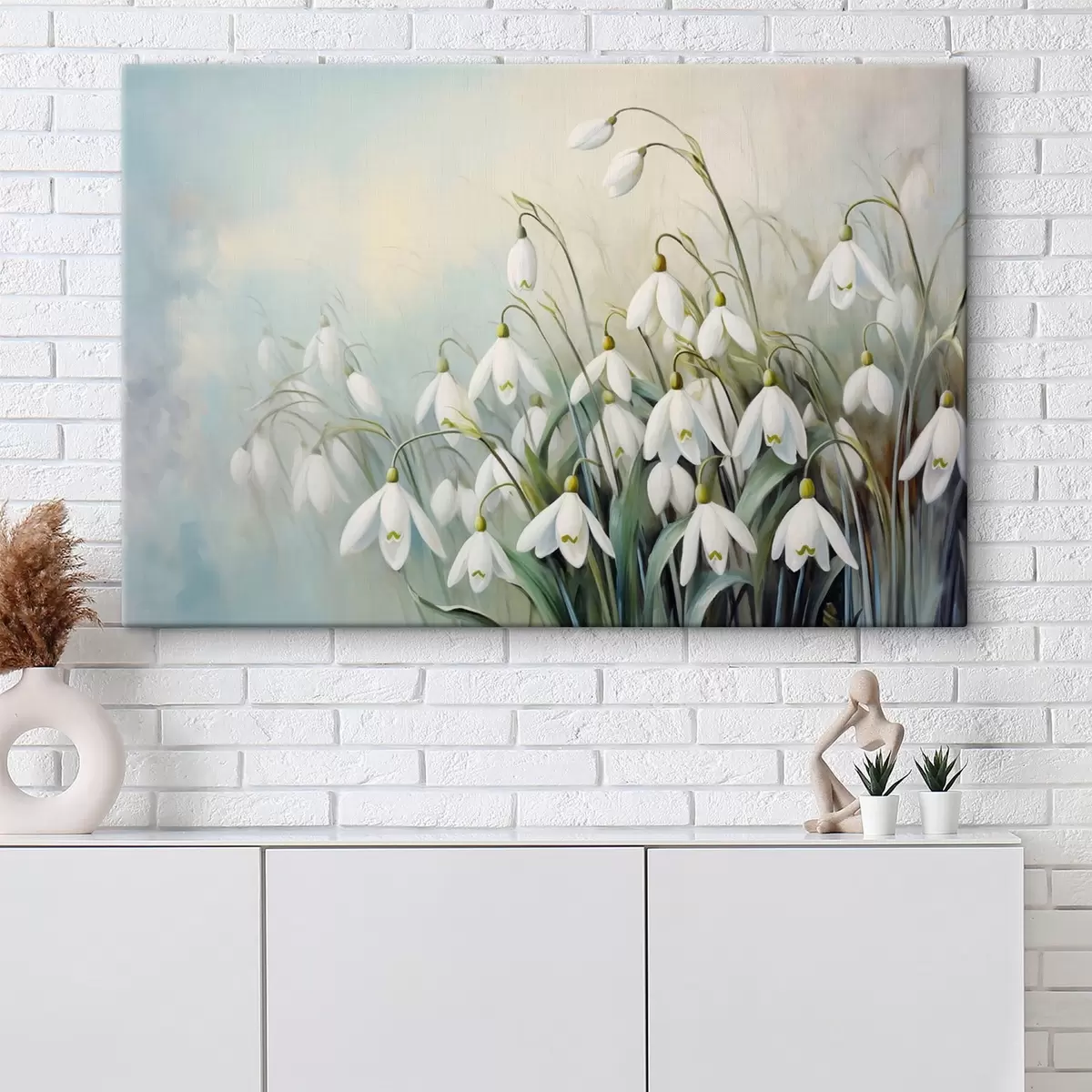 Cuadros Flores blancas de campanillas de invierno con tallos y hojas azules y verdes, pinceladas suaves, fondo difuminado Nr s44864