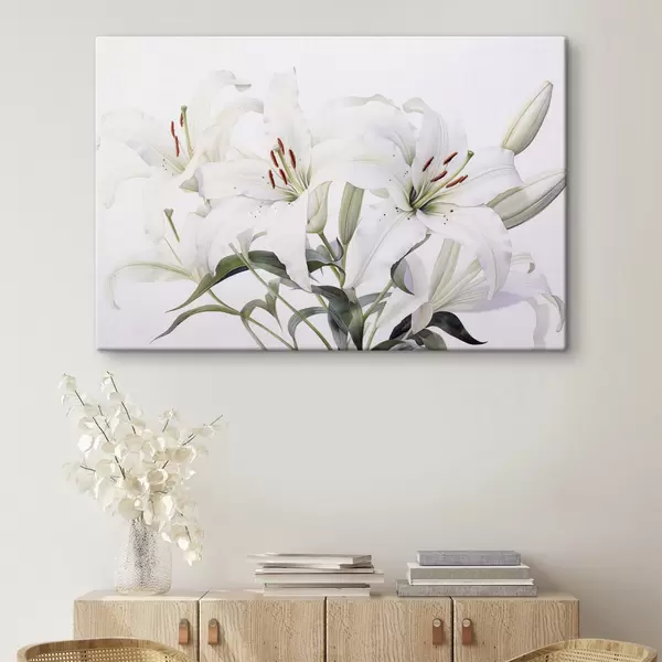 Cuadros Un ramo de lirios blancos con hojas verdes, delicados pétalos y suave fondo blanco Nr s44868