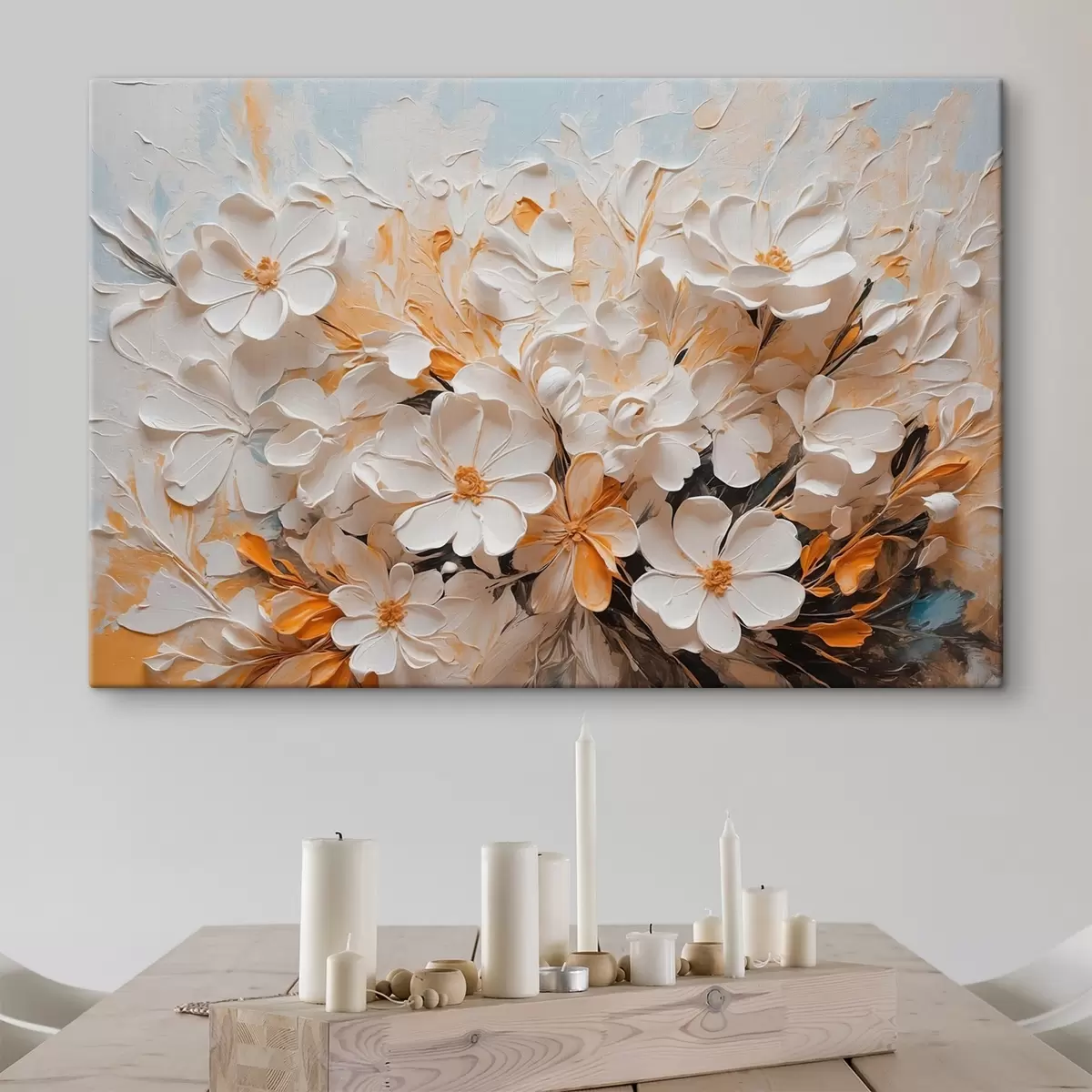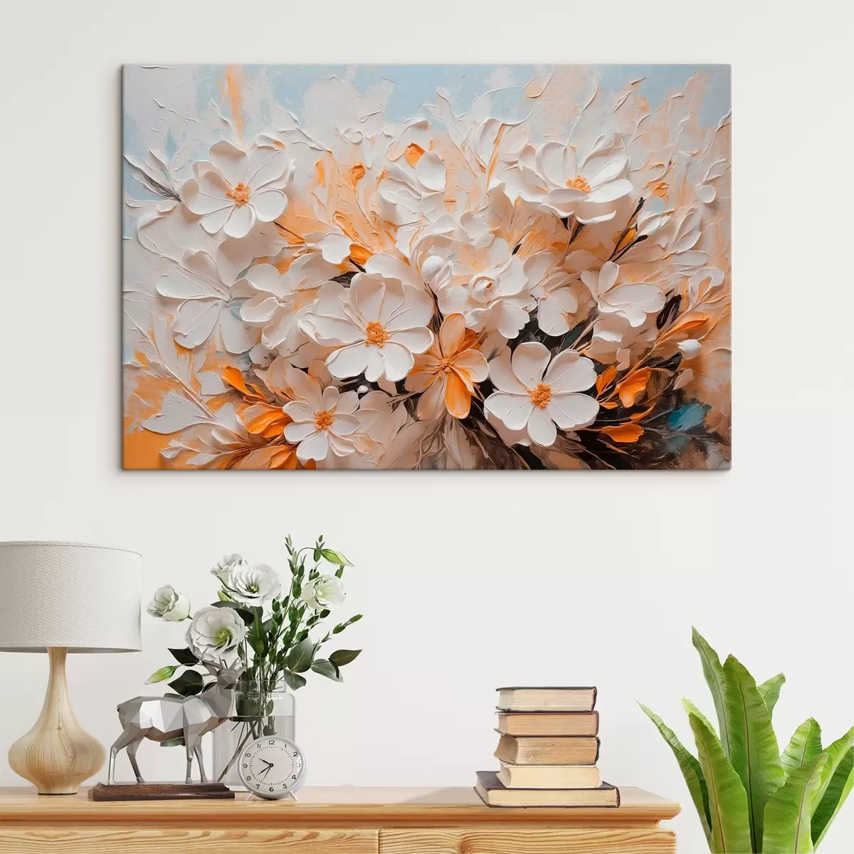 Cuadros Flores blancas y melocotón sobre fondo azul con tonos pastel Nr s44879