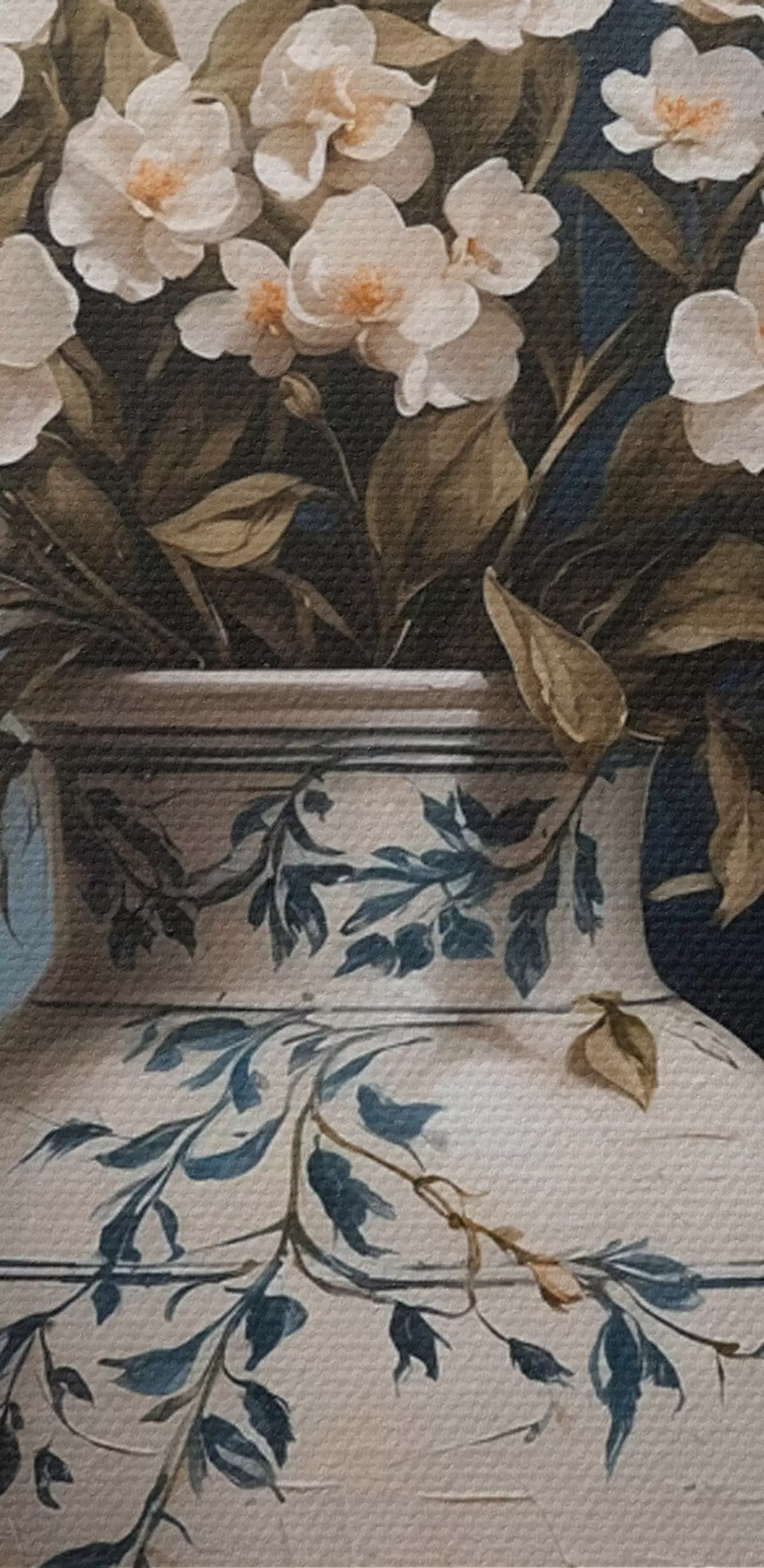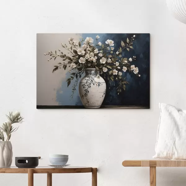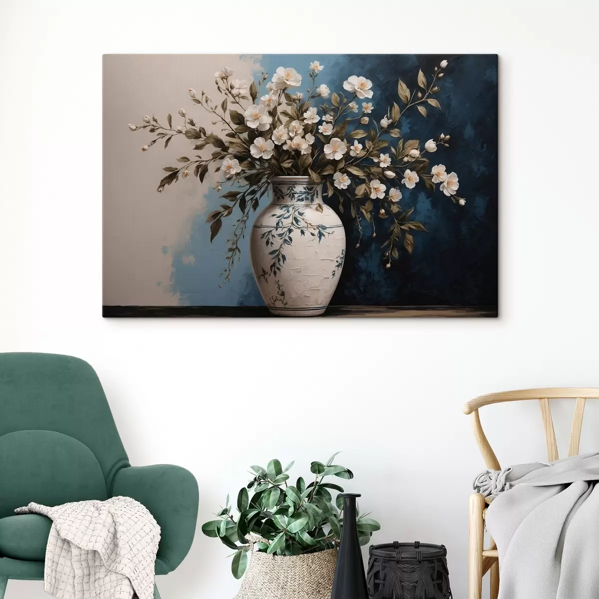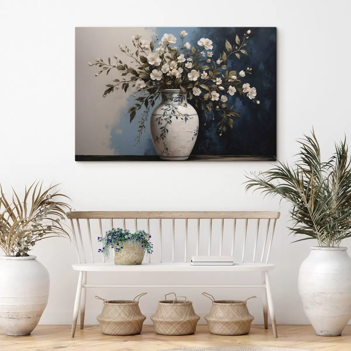 Cuadros Flores blancas y amarillas en un gran jarrón sobre fondo azul Nr s44893
