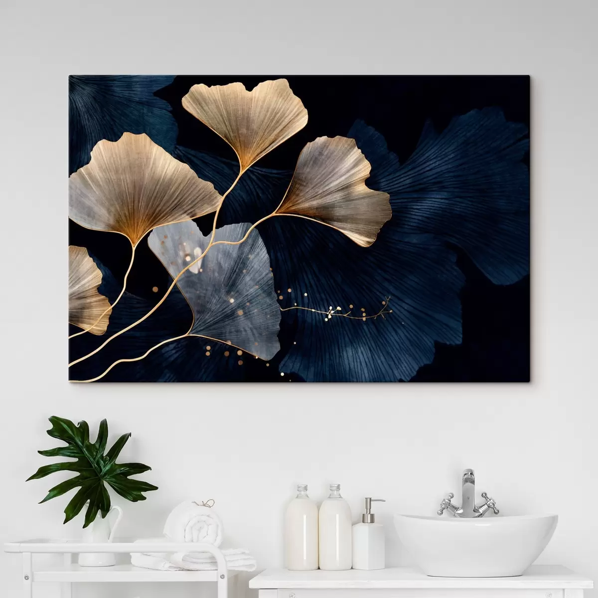 Cuadros Hojas de ginkgo en tonos amarillos y azules, elegante fondo oscuro, arte moderno, estilo minimalista, inspirado en la naturaleza Nr s44921