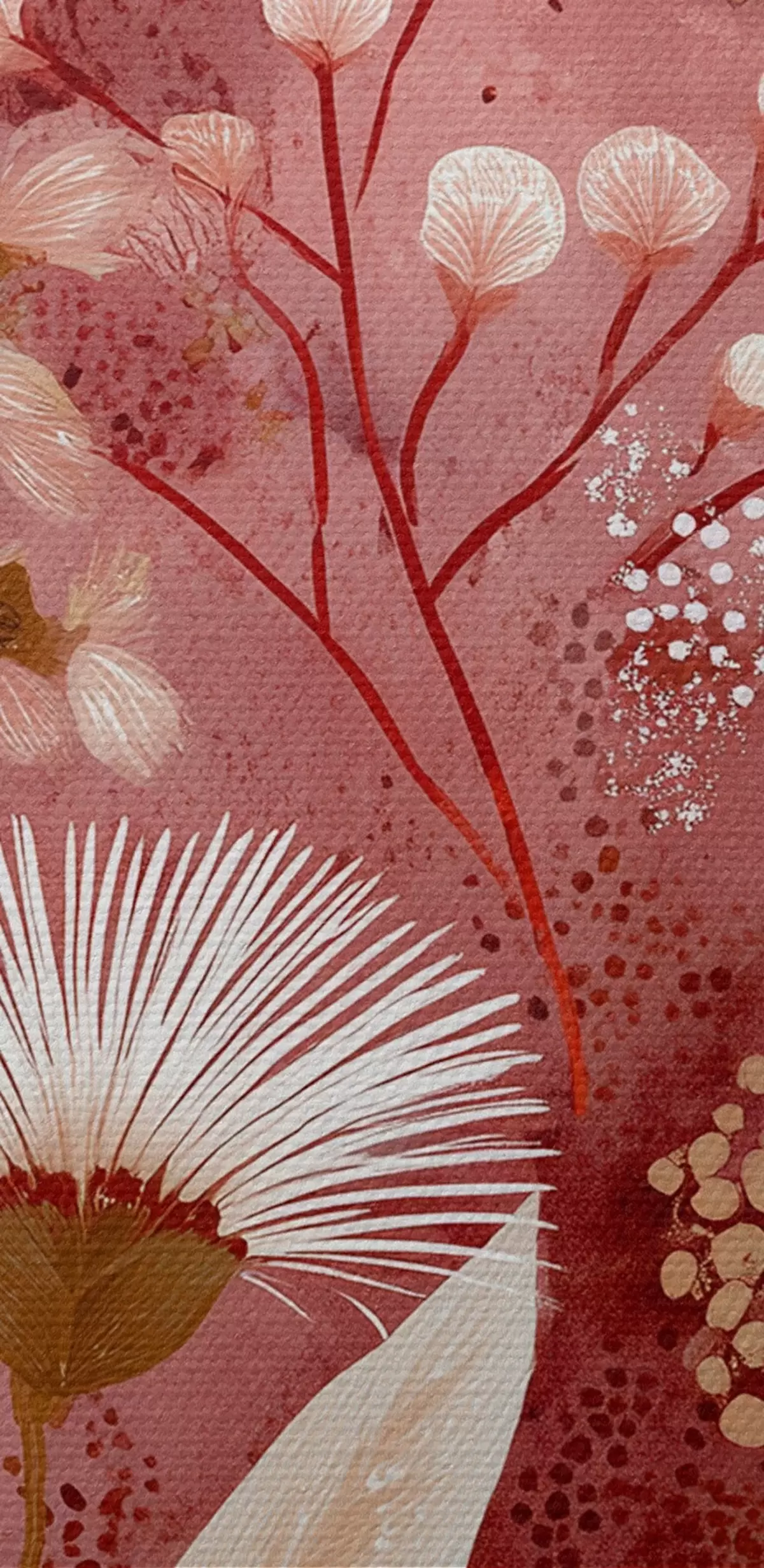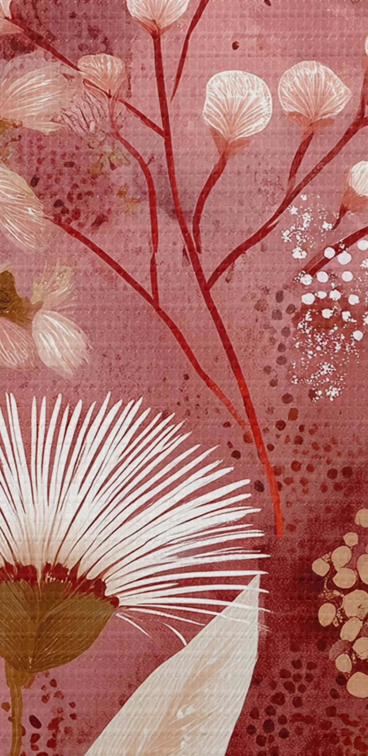 murales de pared Flores blancas de estilo boho sobre fondo rojo, dibujo detallado s44979