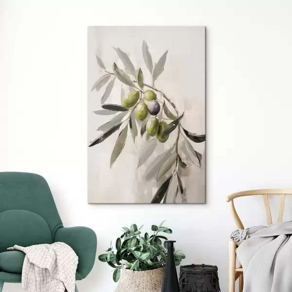 Cuadros aceitunas verdes, detalle de rama, fondo claro, orgánico, paleta natural, rústico Nr s45110
