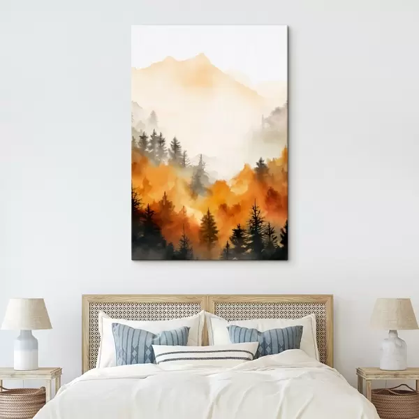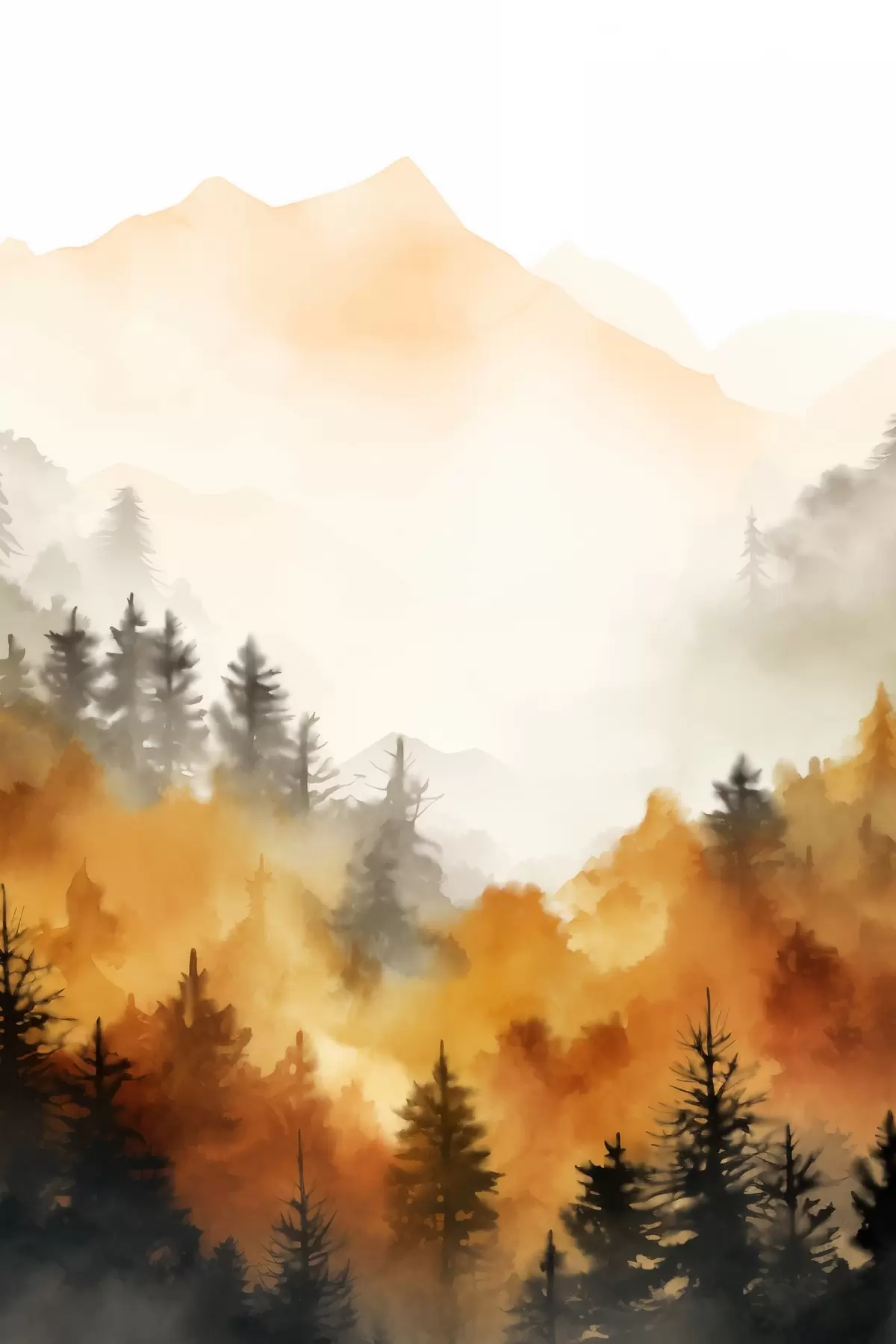 Cuadros Paisaje pintado a la acuarela que imita un bosque con altos pinos y montañas al fondo Nr s45169