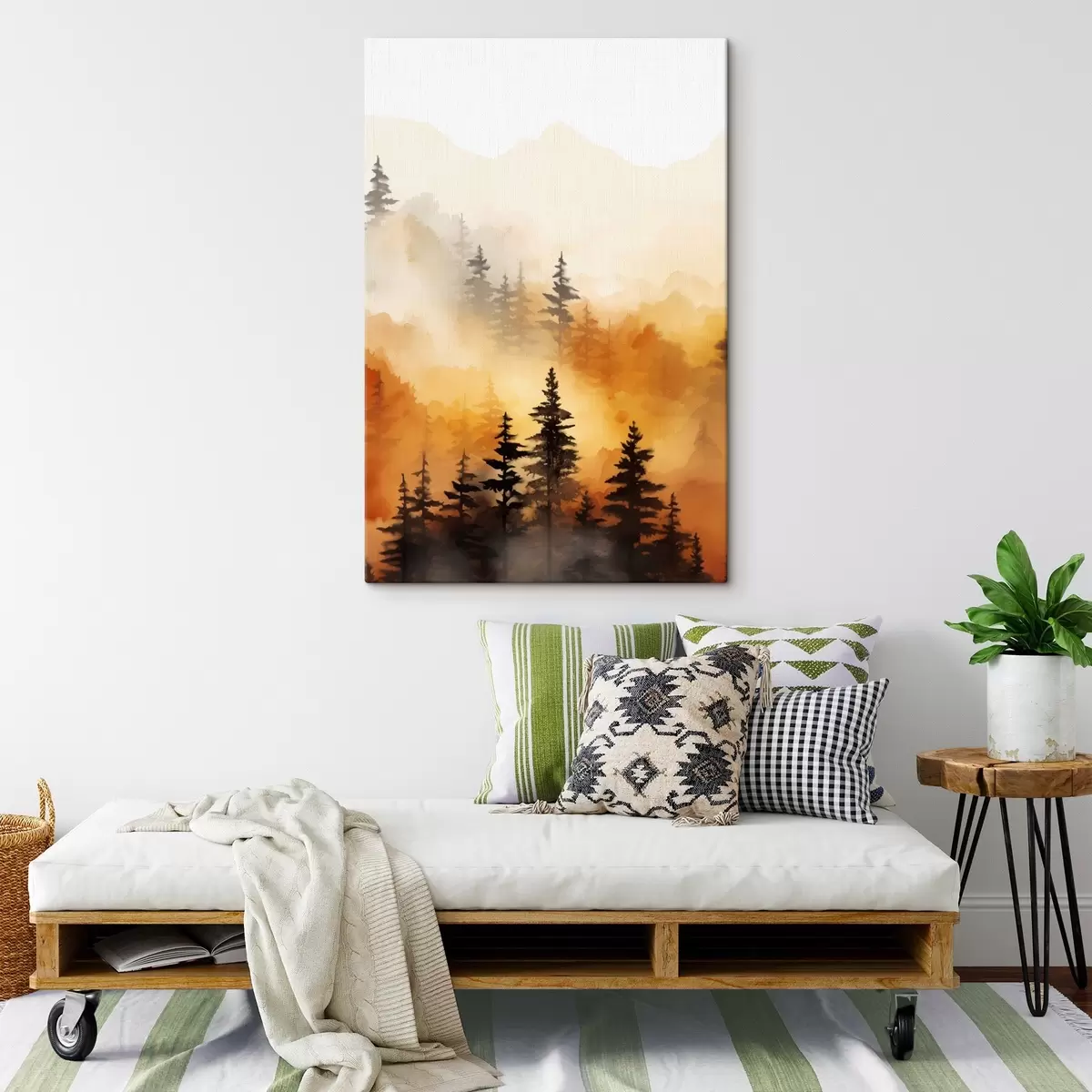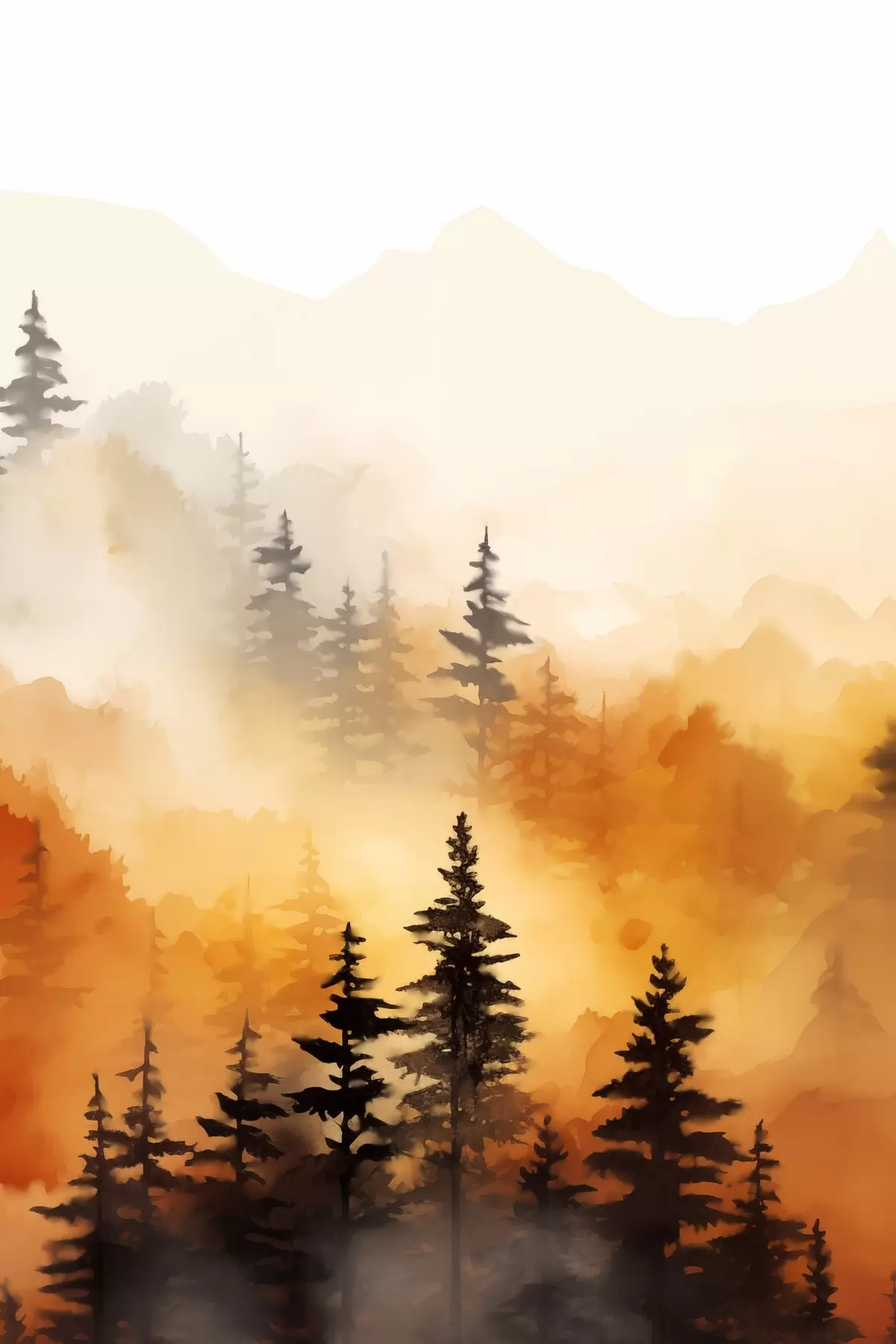 Cuadros Paisaje pintado a la acuarela que imita un bosque con altos pinos y montañas al fondo Nr s45170