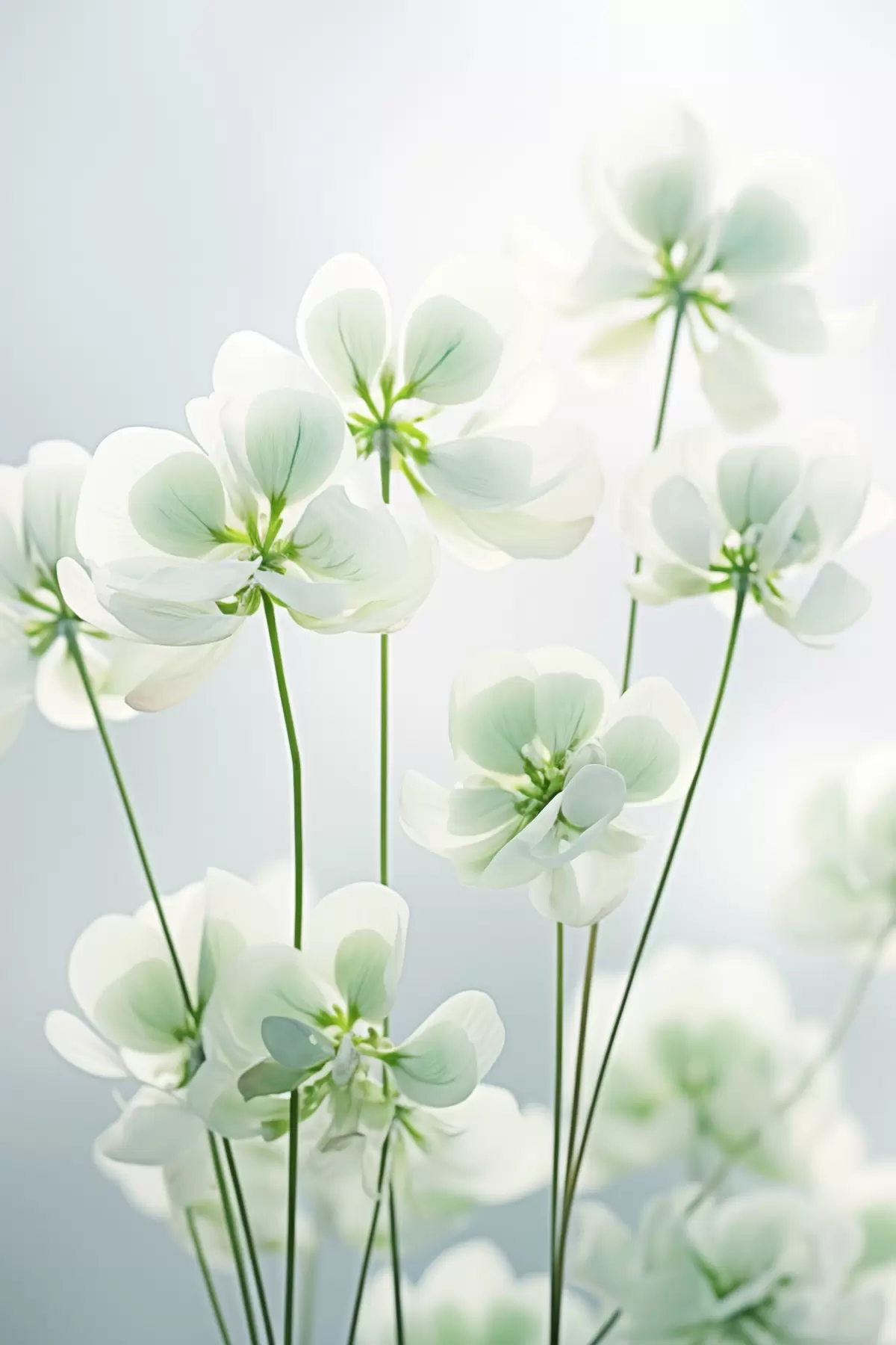 murales de pared Flores de trébol blanco con tallo y hojas verdes, iluminación suave, fondo limpio, composición minimalista, botánica s45172