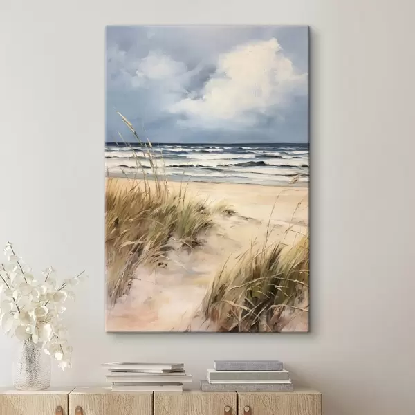Cuadros Una playa de arena con hierba alta en primer plano, el océano con olas y un cielo nublado al fondo Nr s45173
