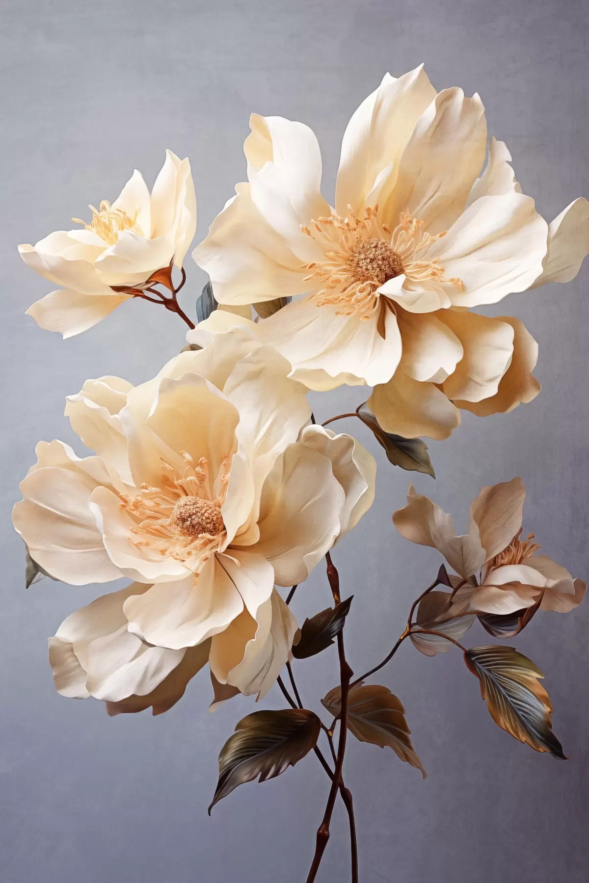 Cuadros Flores texturizadas con pistilos naranjas y hojas naranjas sobre fondo gris, luz suave, elegante, detallado, realista Nr s45182