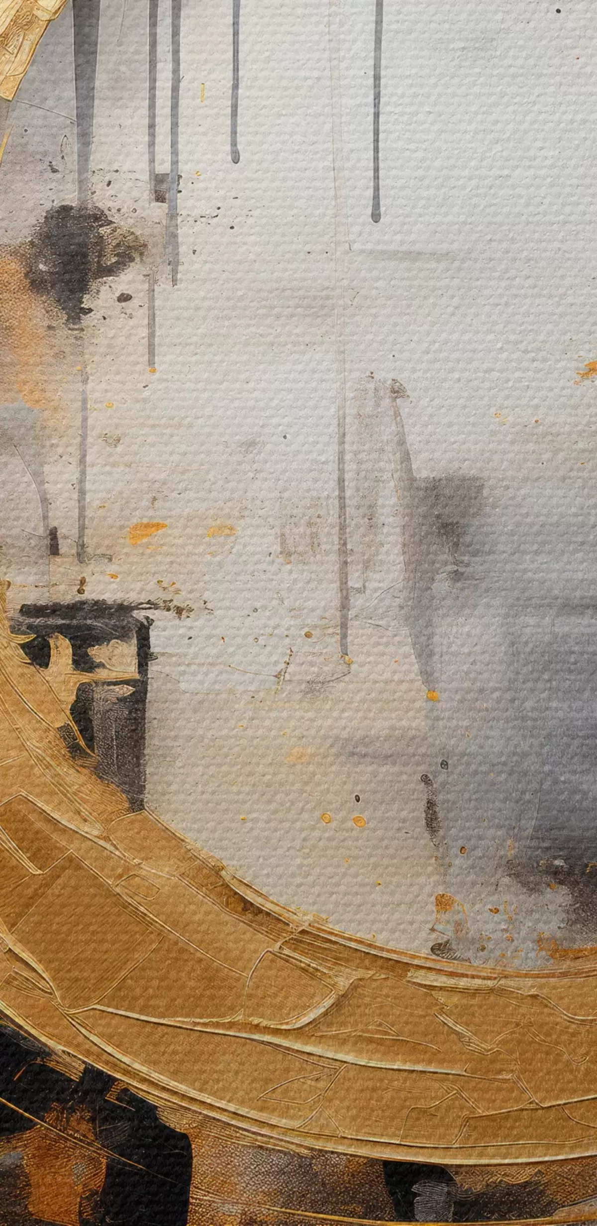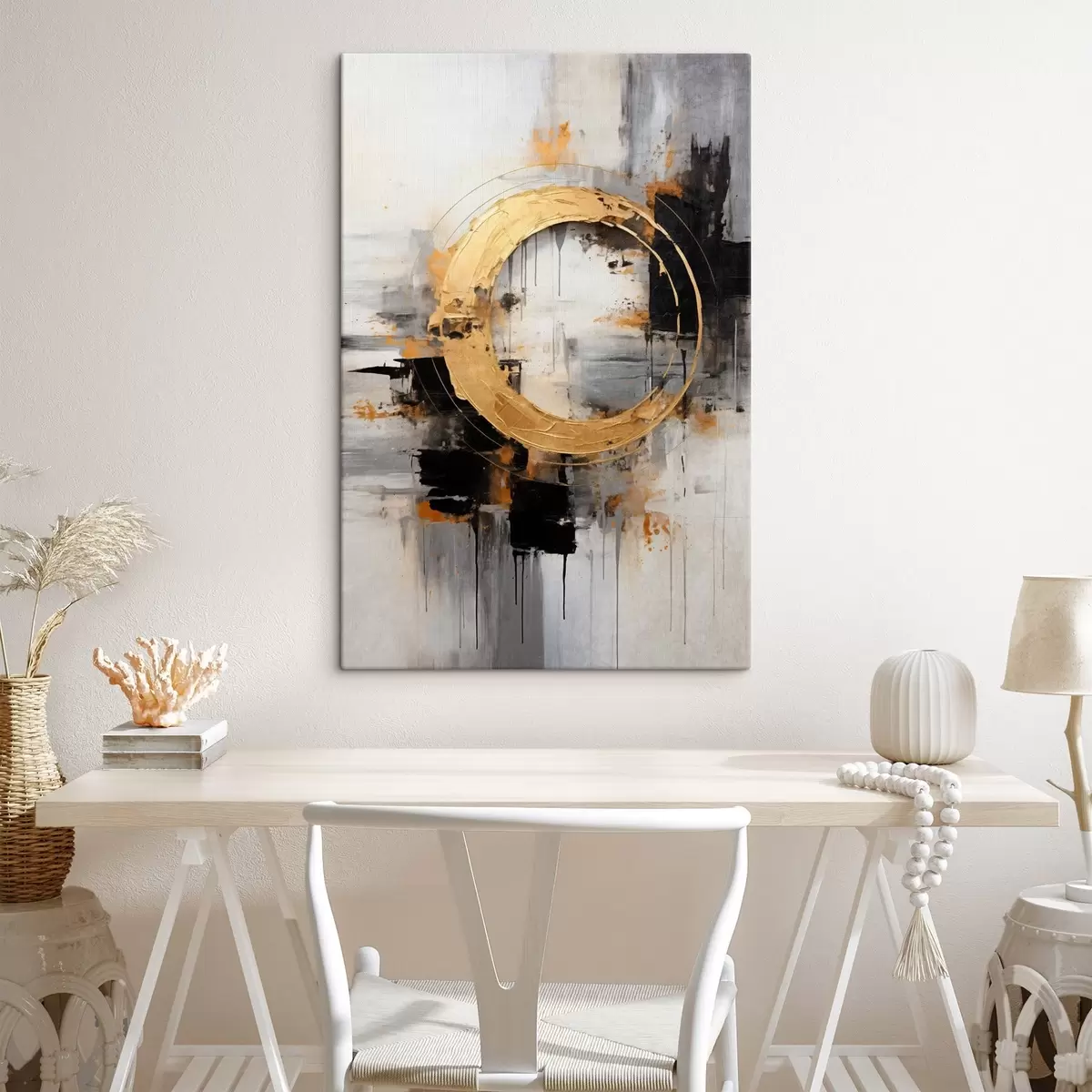 Cuadros Cuadro abstracto con círculos, líneas negras y amarillas, y un fondo con tonos grises y blancos Nr s45186