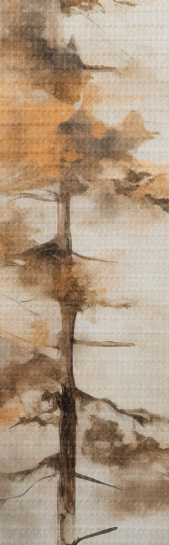 Cuadros Árboles altos con textura y hojas amarillas en un bosque , el fondo es una mezcla de suaves tonos azules y marrones Nr s45188