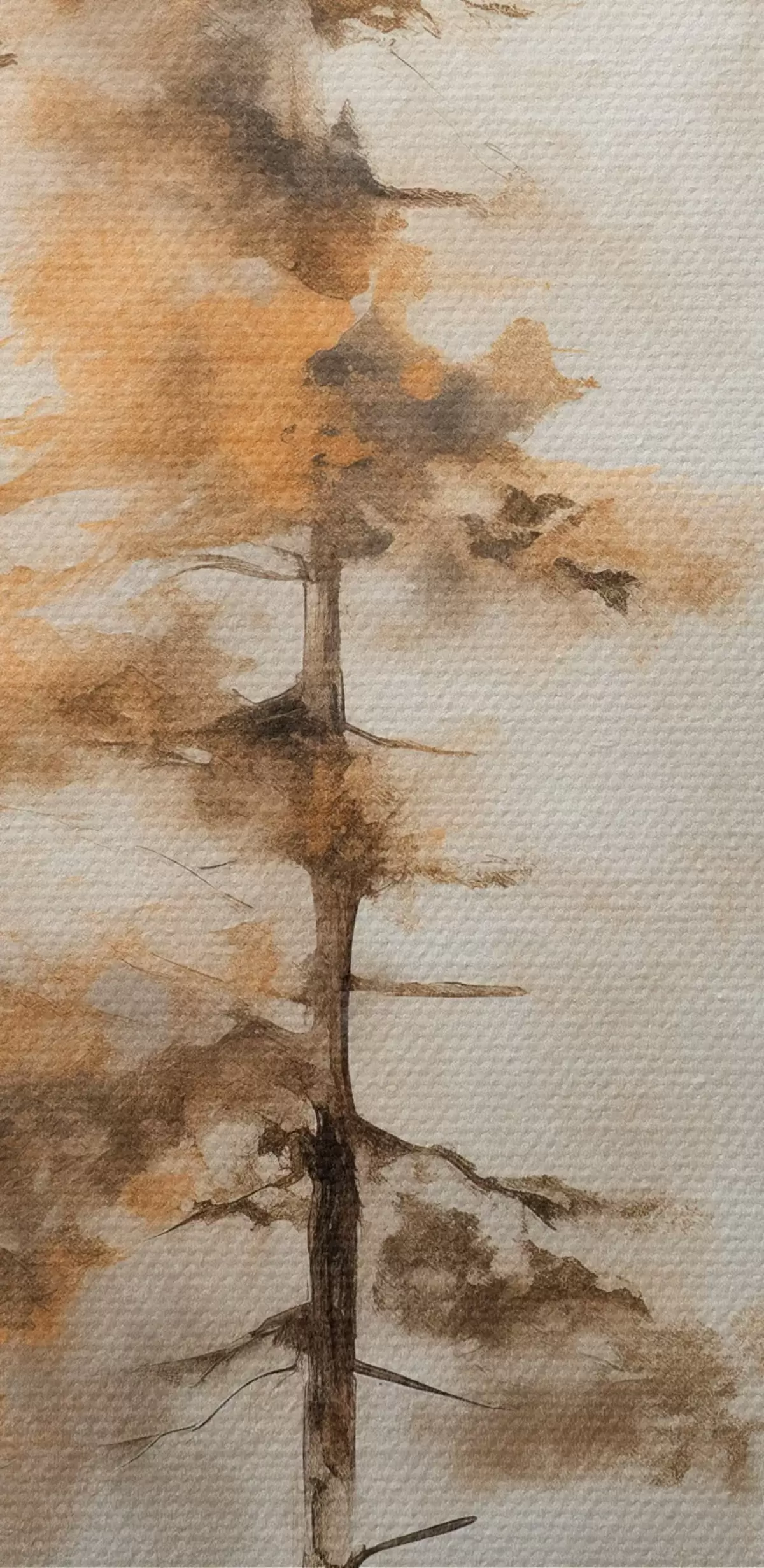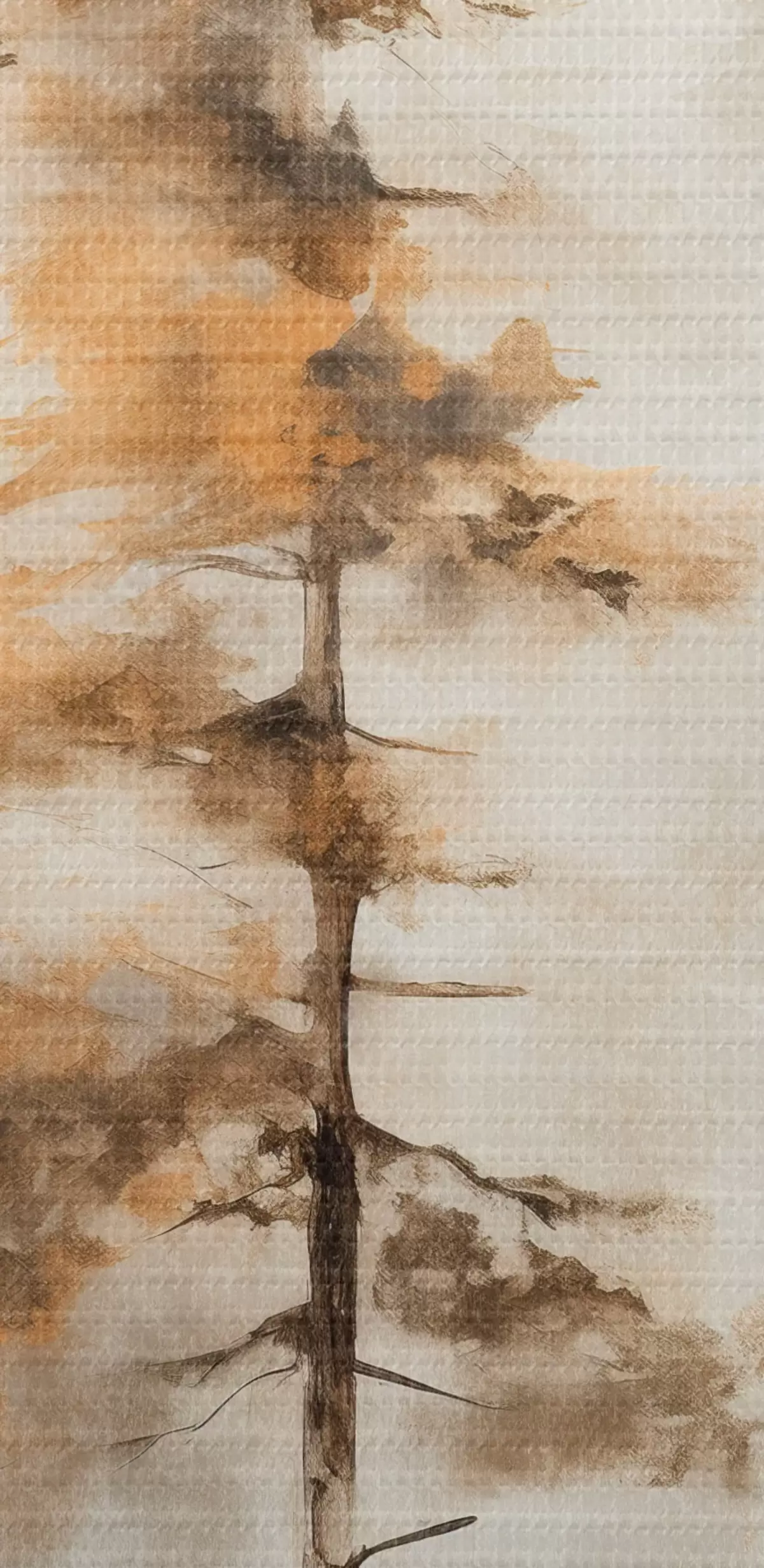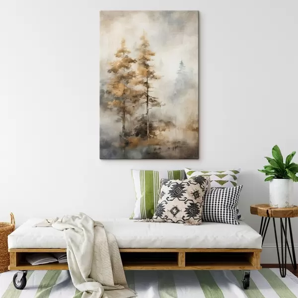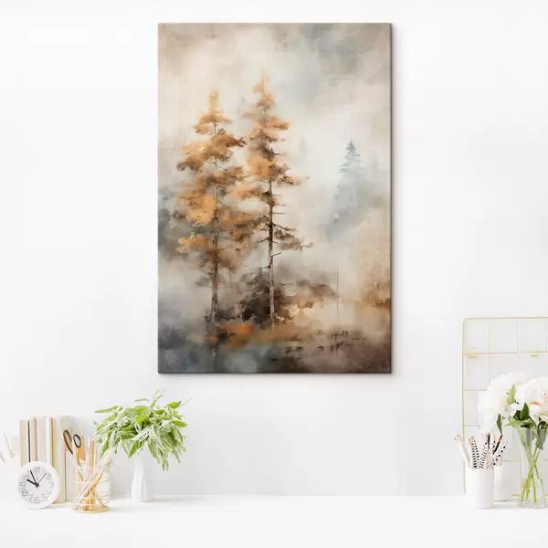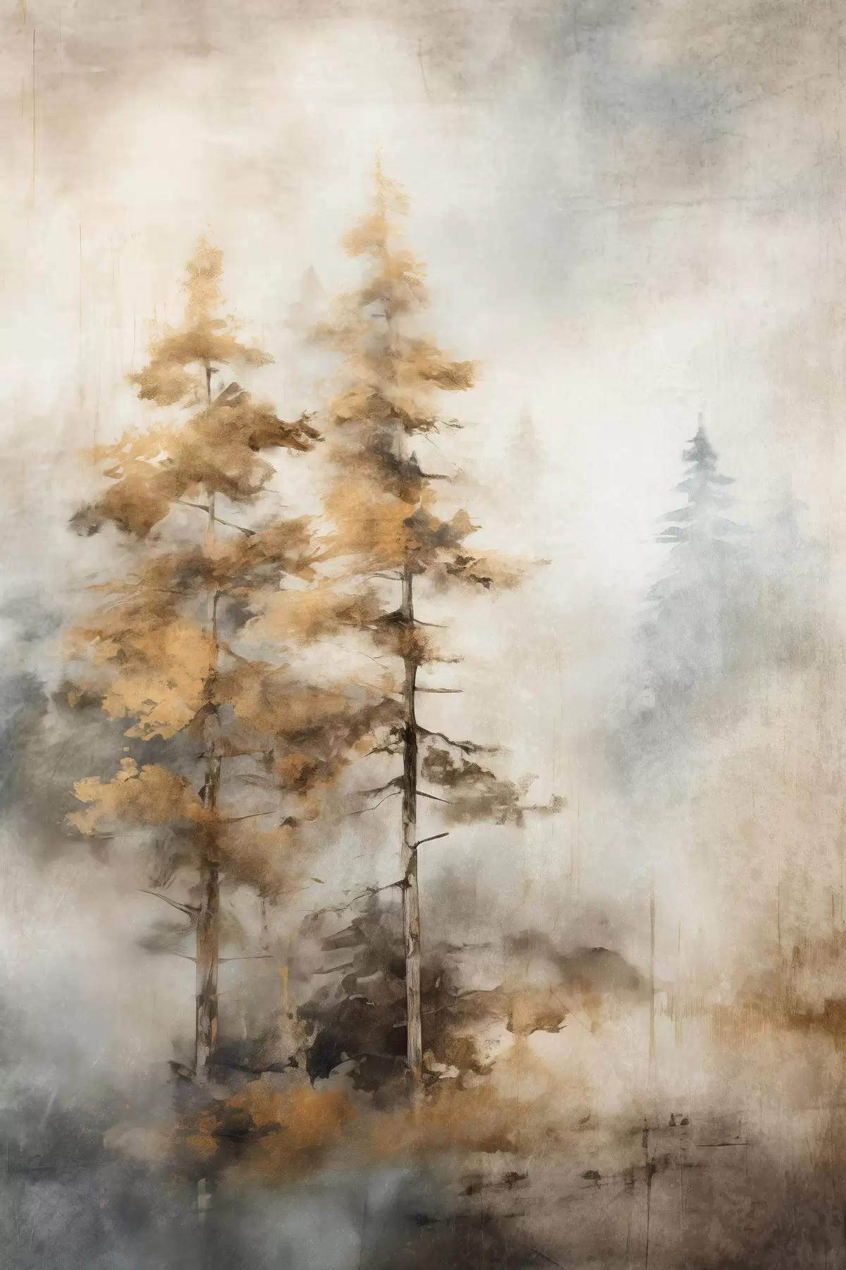 Cuadros Árboles altos con textura y hojas amarillas en un bosque , el fondo es una mezcla de suaves tonos azules y marrones Nr s45188