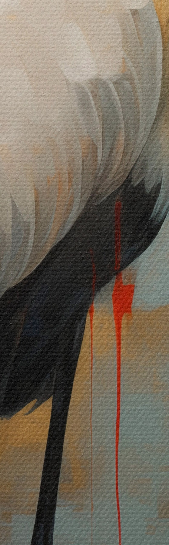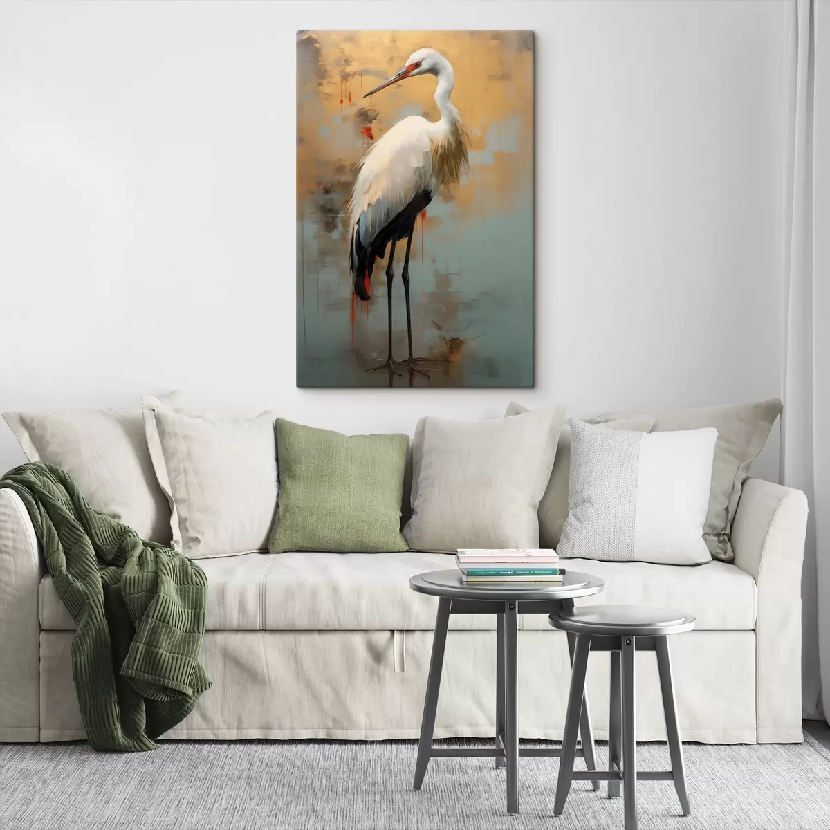 Cuadros Garza blanca sobre un fondo de tonos amarillos, marrones y azules apagados que sugieren un paisaje brumoso y abstracto Nr s45191