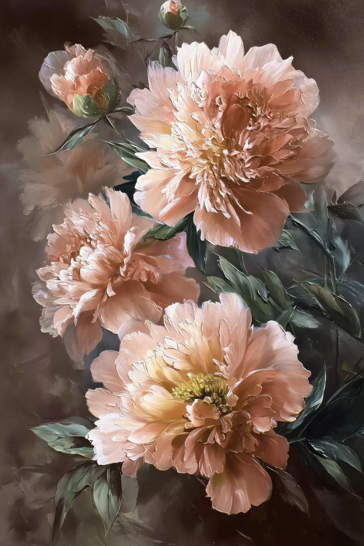 Cuadros Ramo de peonías rosas con trazos atrevidos sobre fondo oscuro Nr s45260