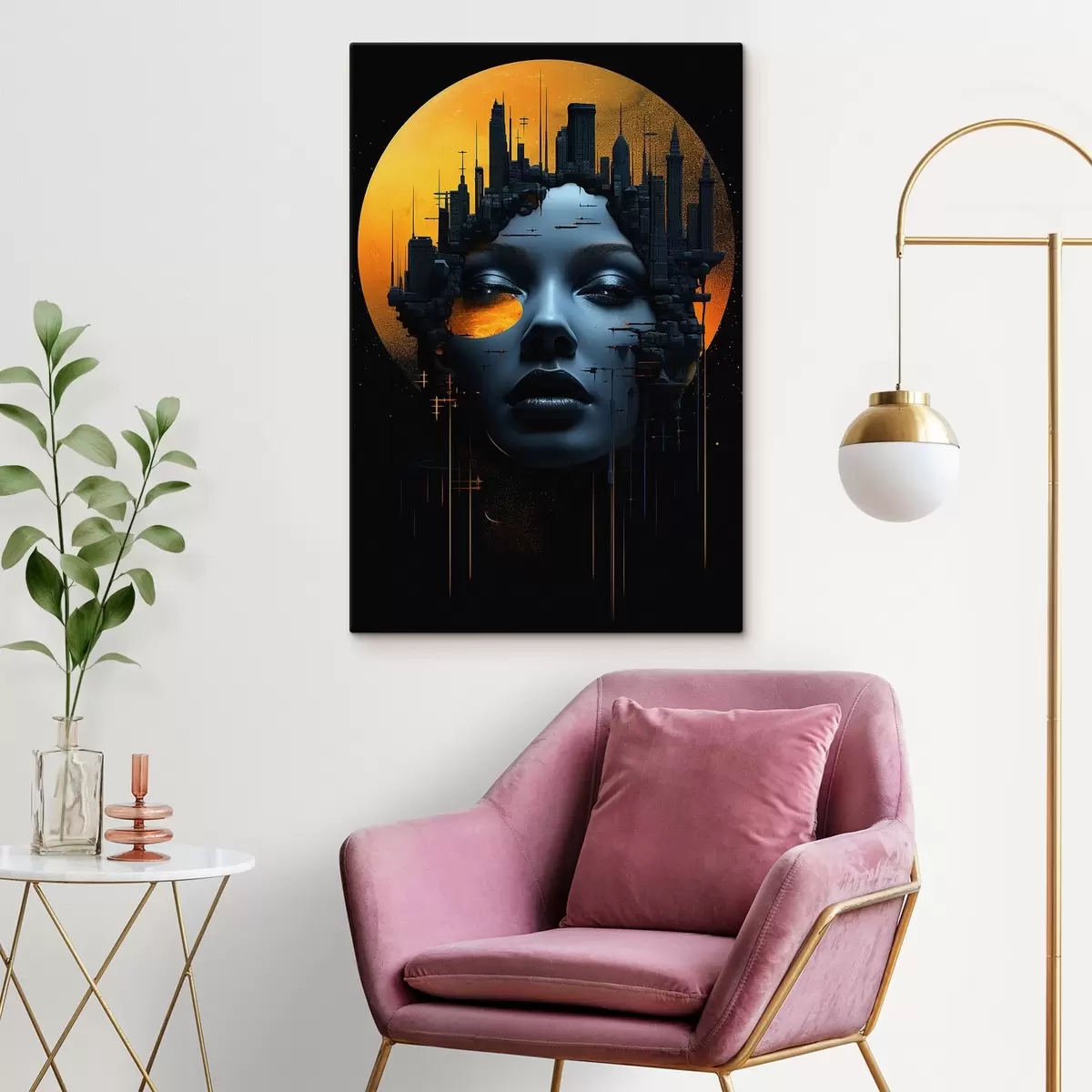Cuadros Gente, cara de chica sobre fondo de ciudad, abstracto Nr s45341