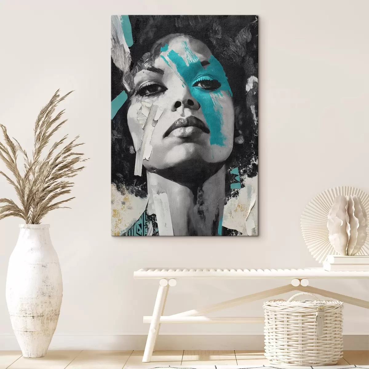 murales de pared Retrato en técnica mixta con fragmentos de pinceladas de color y texturas s45416