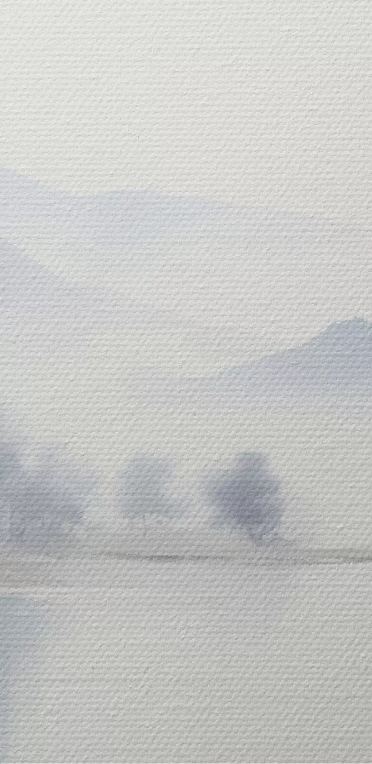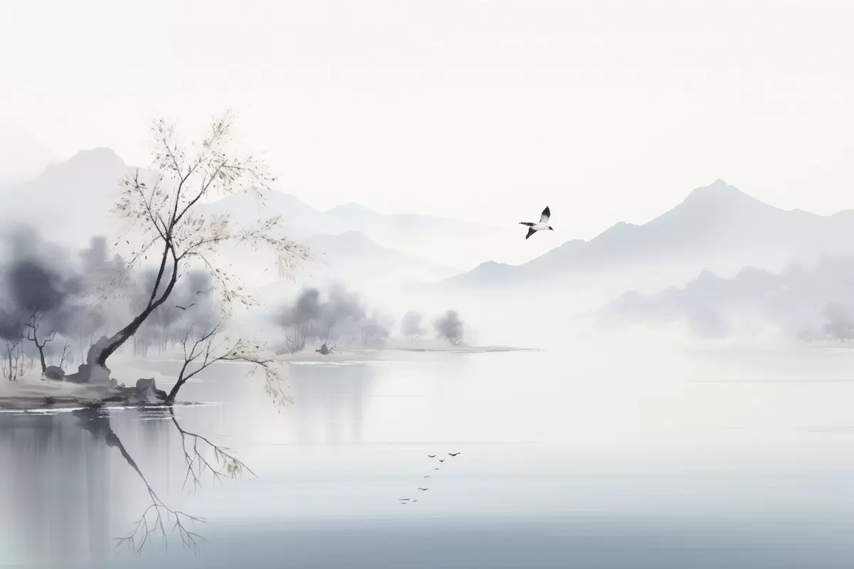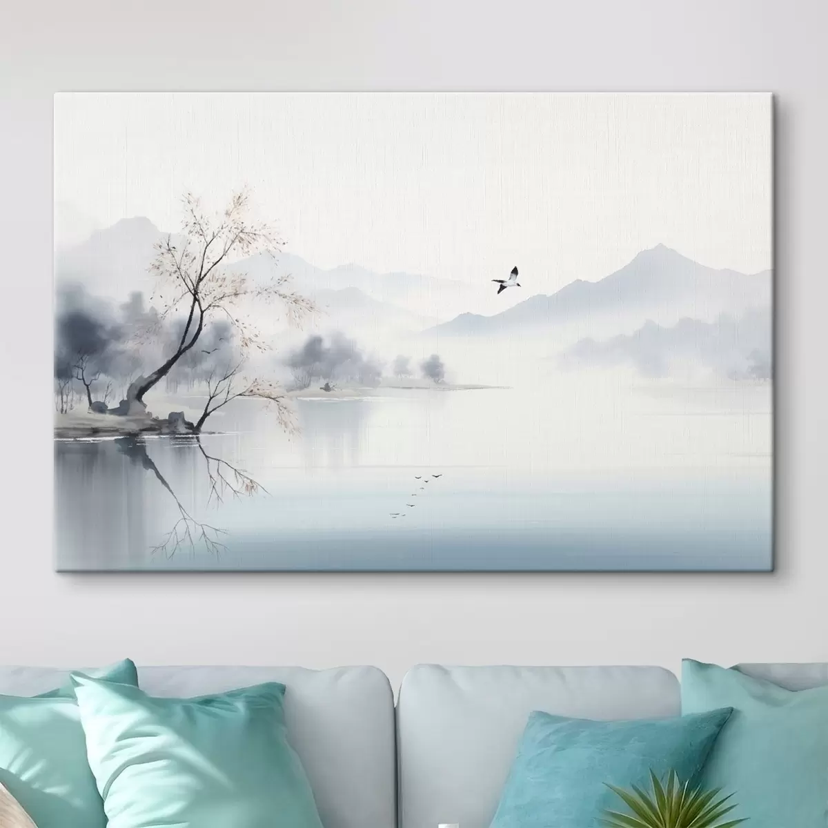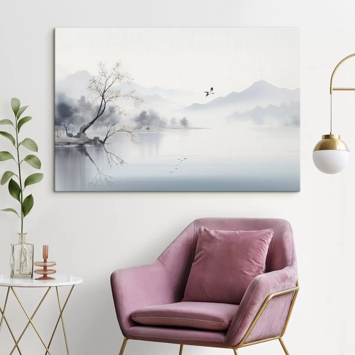 Cuadros Paisaje brumoso con un árbol, montañas y pájaros Nr s45518