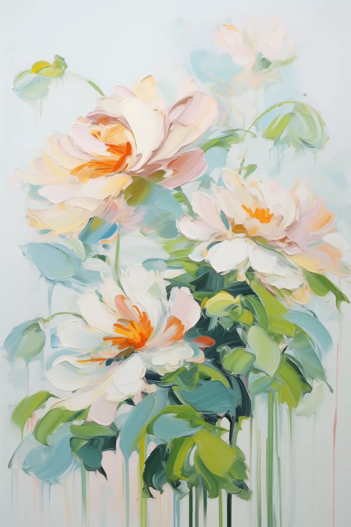 Cuadros Flores blancas y pastel melocotón, hojas verdes, pinceladas suaves imitación pintura al óleo, fondo azul claro Nr s45550