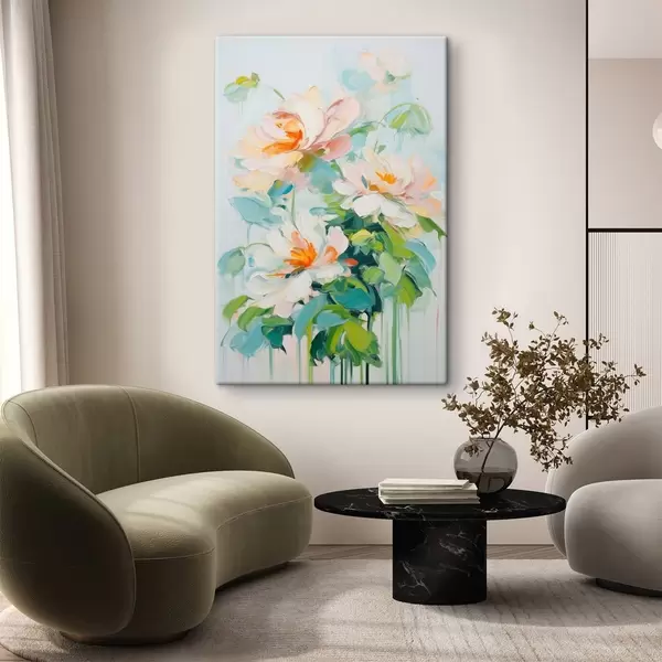 Cuadros Flores blancas y pastel melocotón, hojas verdes, pinceladas suaves imitación pintura al óleo, fondo azul claro Nr s45550