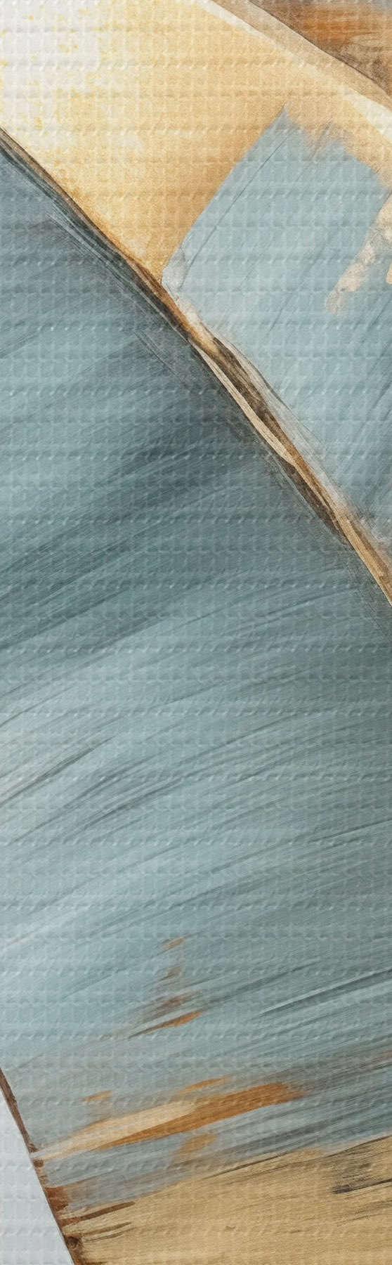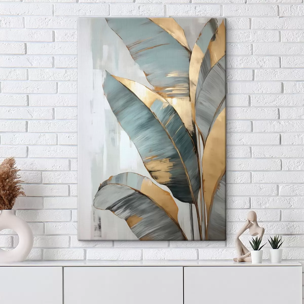 Cuadros Conjunto de hojas de plátano azules, grises y amarillas con pinceladas visibles, sobre un fondo blanco abstracto Nr s45551