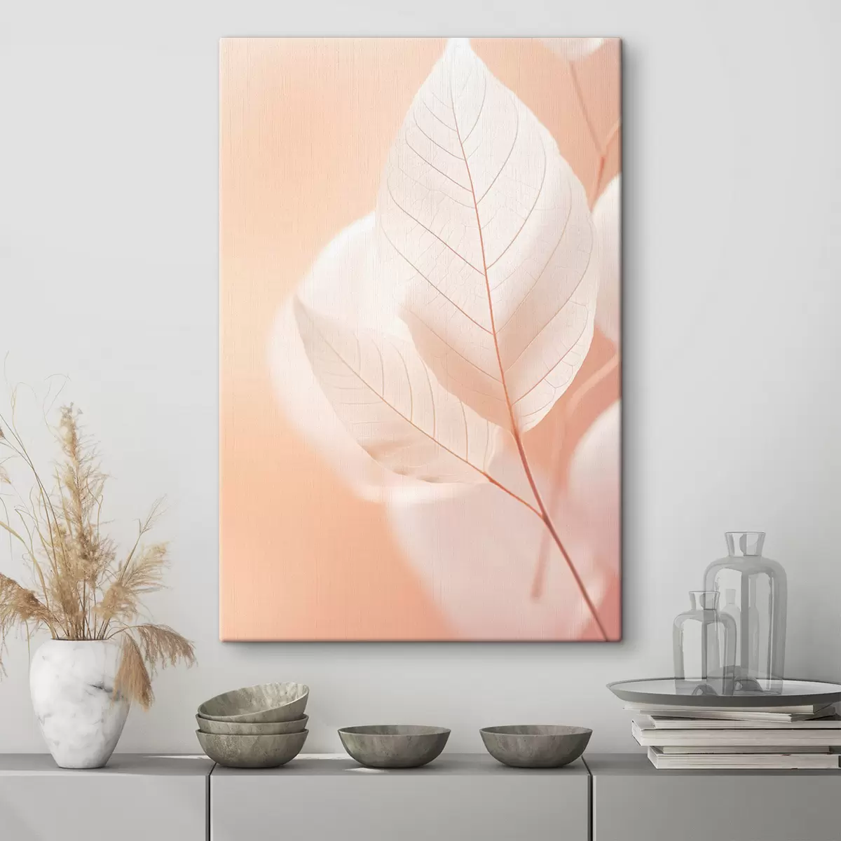 Cuadros Delicadas hojas translúcidas con intrincados dibujos de venas, fondo melocotón suave, composición botánica minimalista Nr s45555