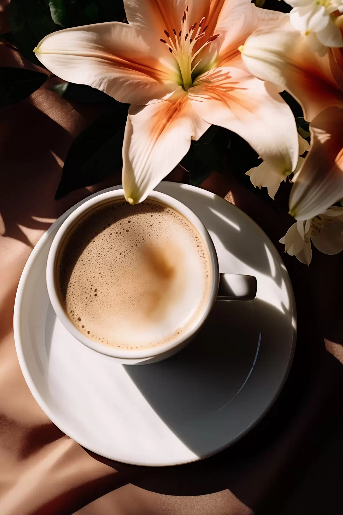 murales de pared Una taza de café con espuma en un plato blanco, unas flores al fondo, con luz solar s45569