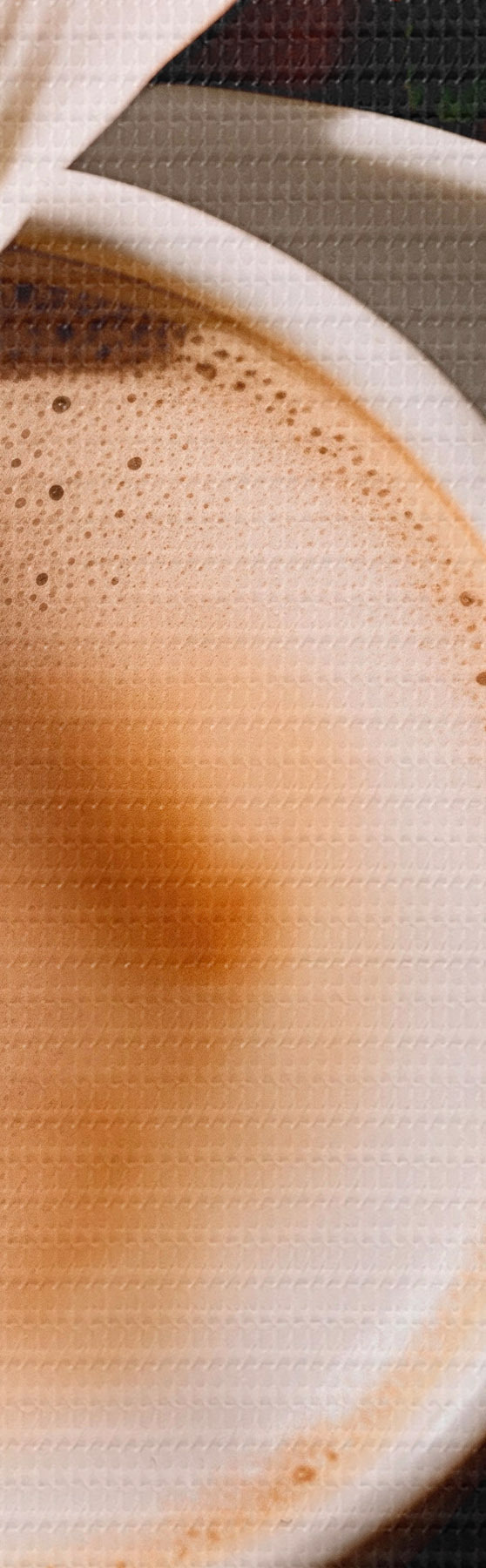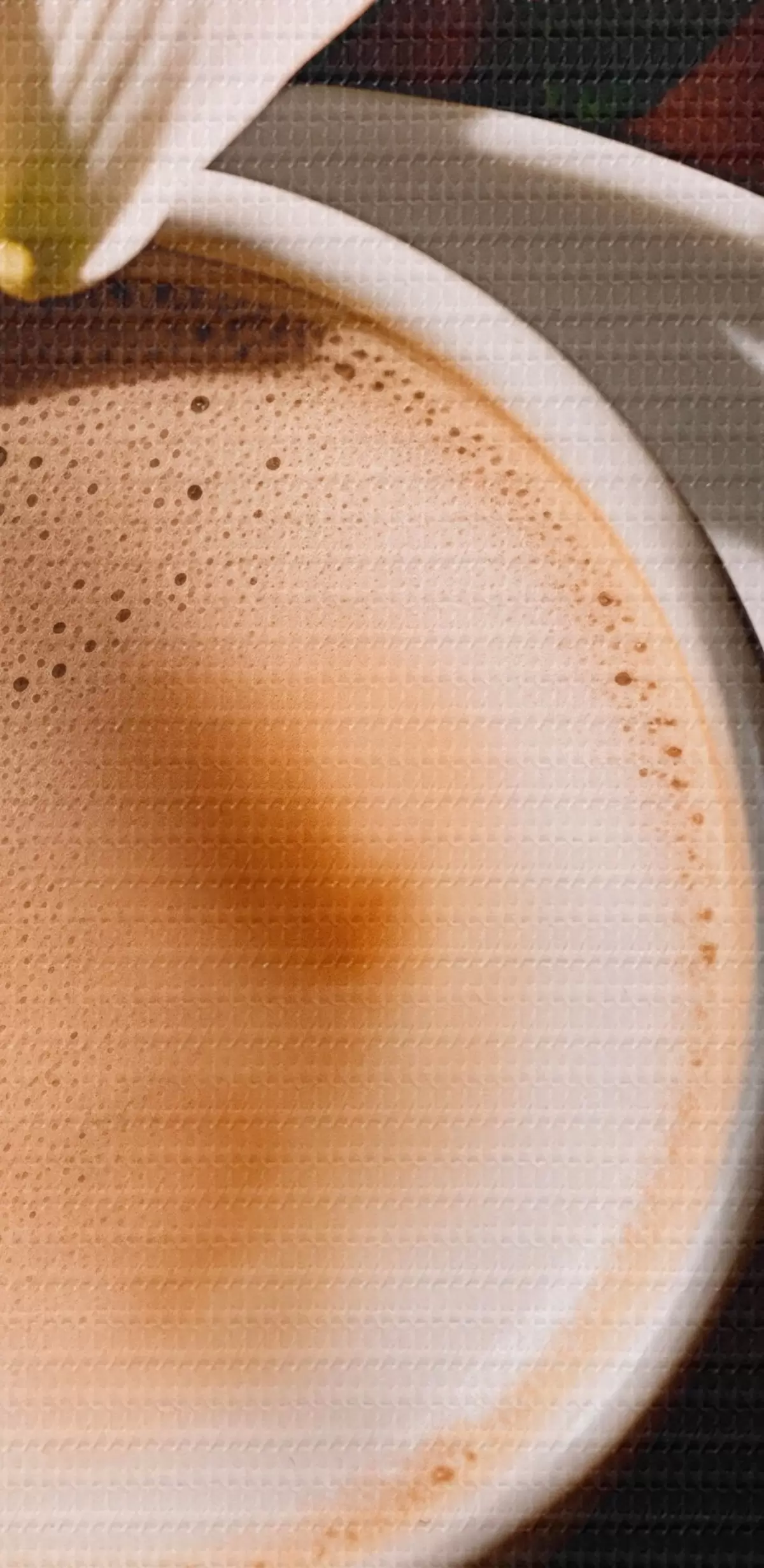 Cuadros Una taza de café con espuma en un plato blanco, unas flores al fondo, con luz solar Nr s45569