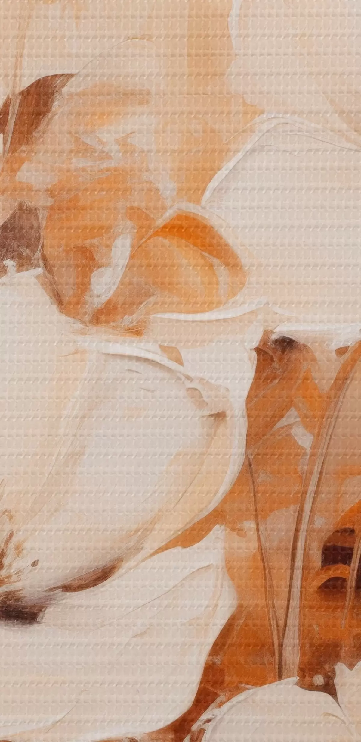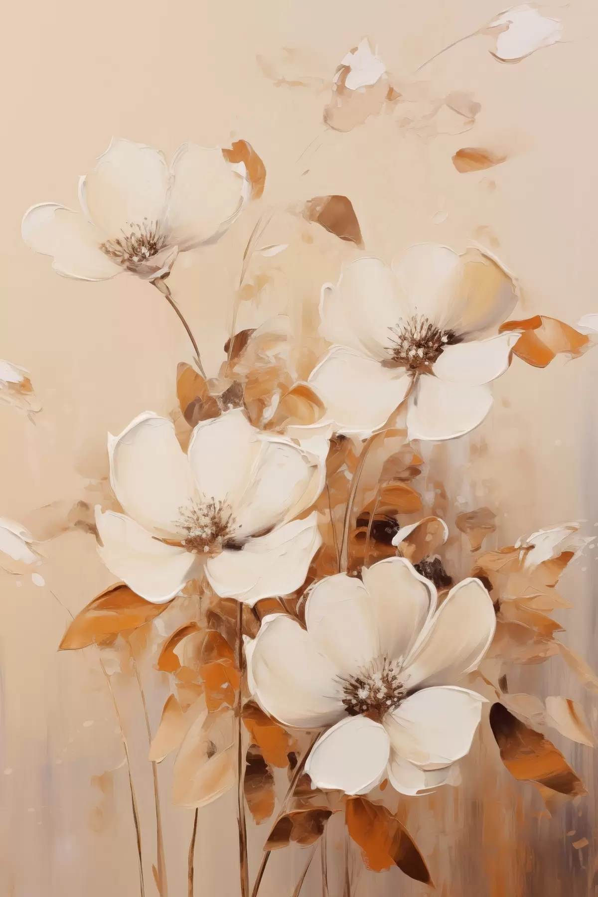 murales de pared Flores blancas con hojas naranjas, pinceladas delicadas, paleta de colores cálidos, composición elegante s45573