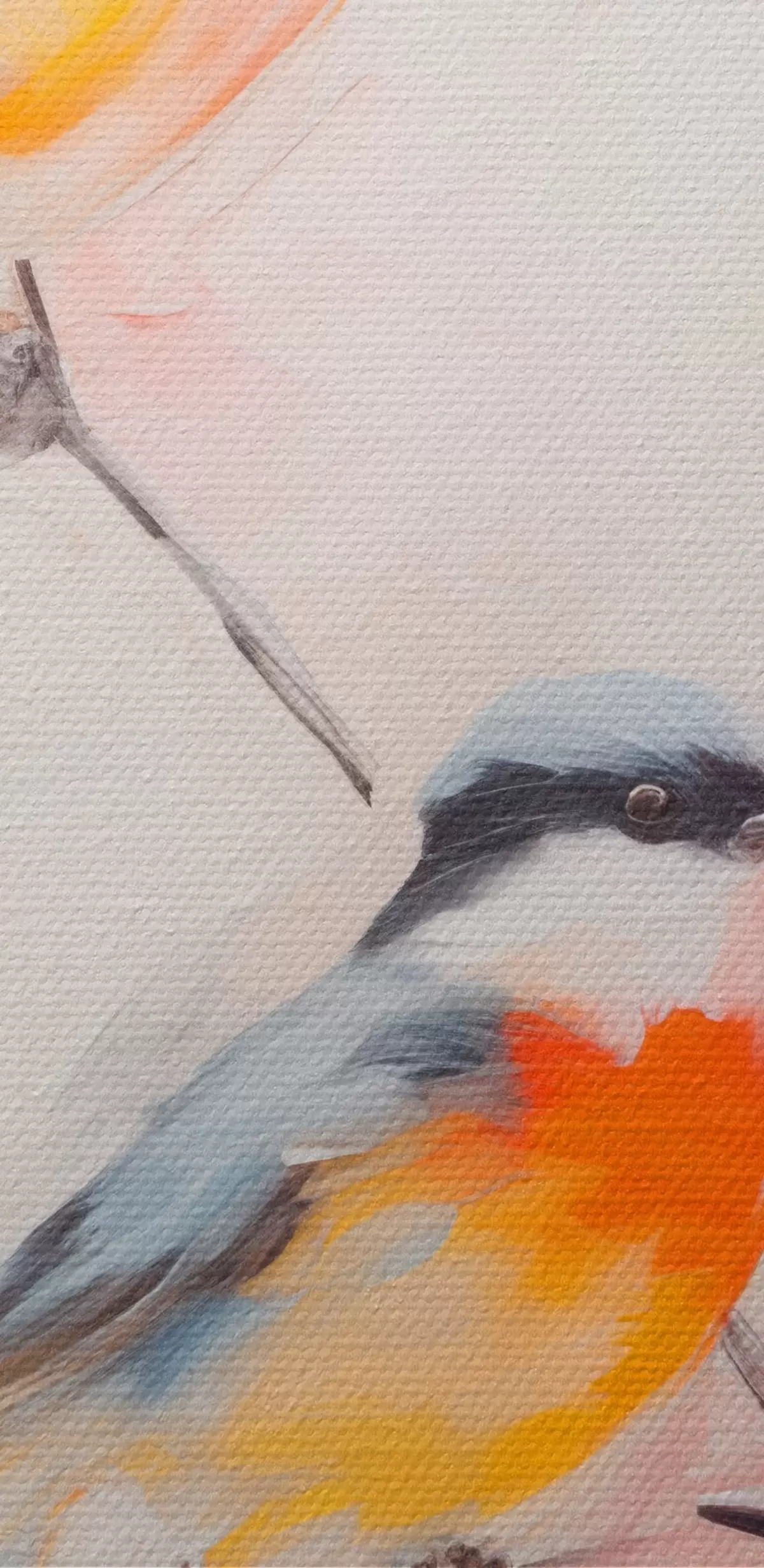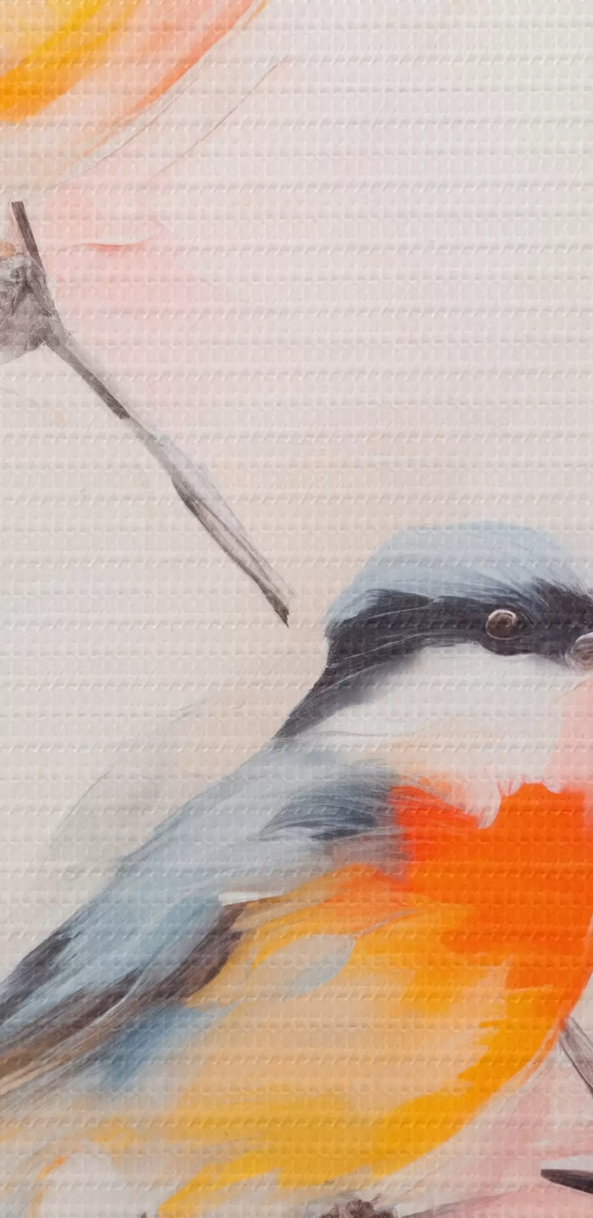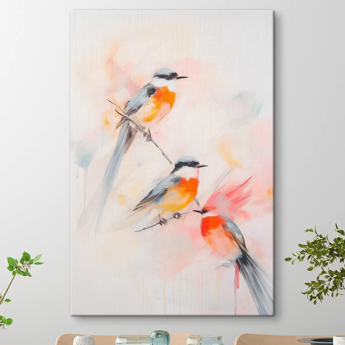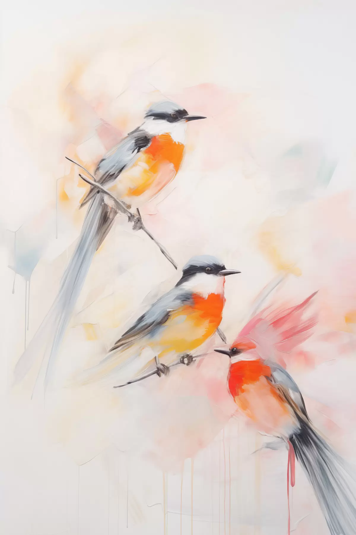 Cuadros Pájaros posados en ramas , suaves colores pastel, fondo claro con tonos rosas y blancos Nr s45577