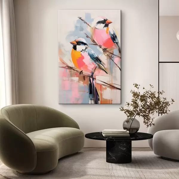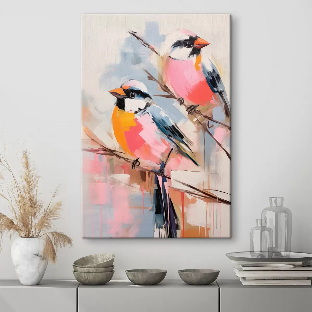 Cuadros Pájaros de colores posados en una rama sobre un fondo de suaves colores pastel Nr s45578