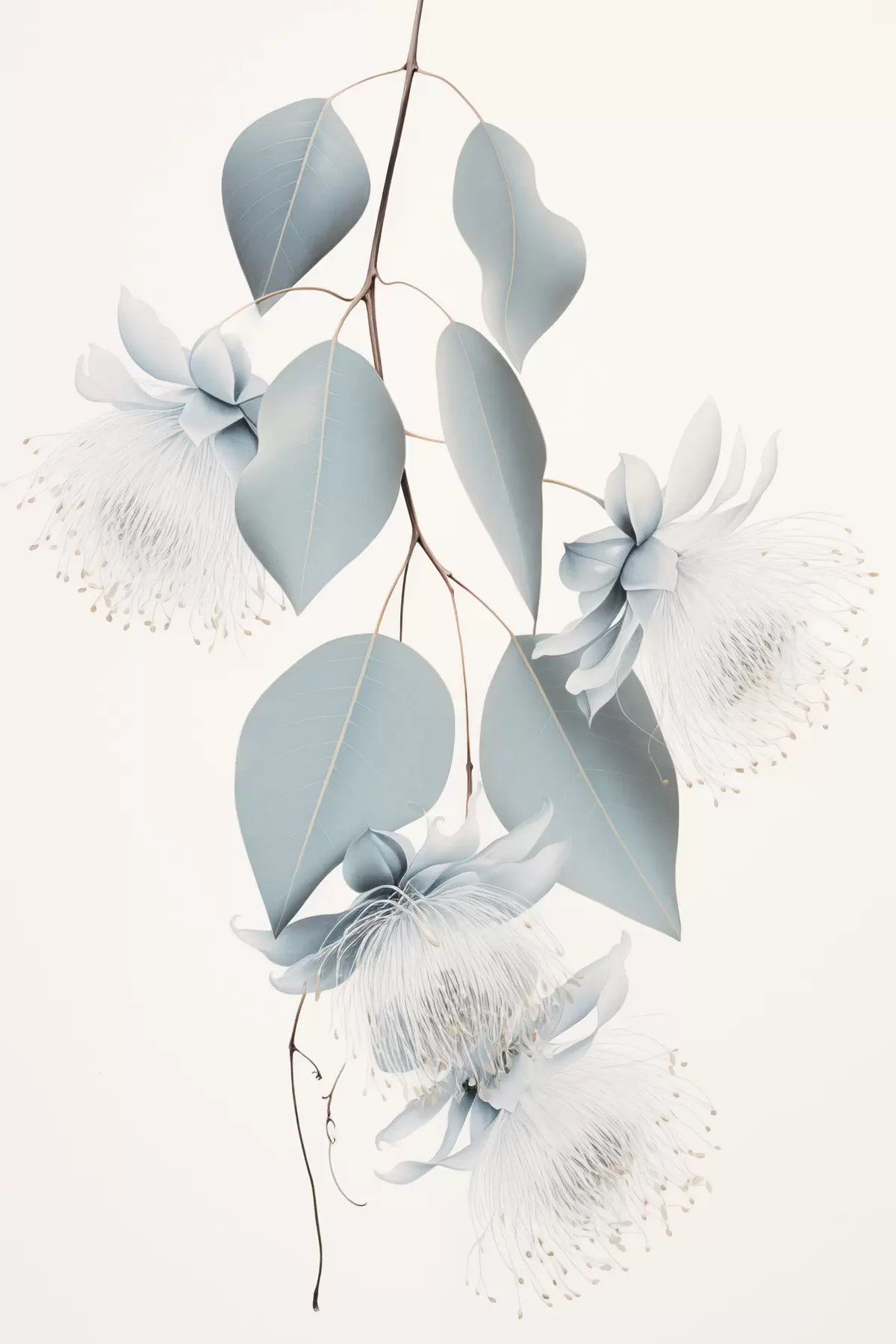 Cuadros Rama de eucalipto con hojas azules y flores blancas, fondo claro Nr s45947