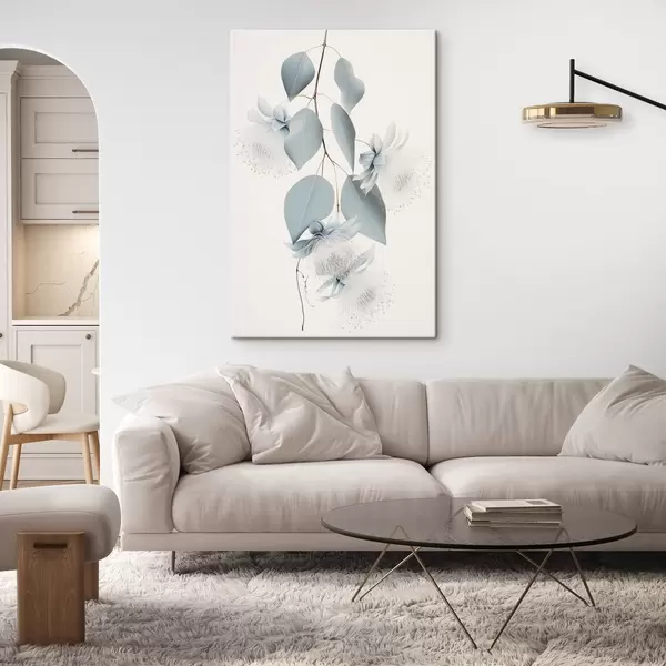 Cuadros Rama de eucalipto con hojas azules y flores blancas, fondo claro Nr s45947