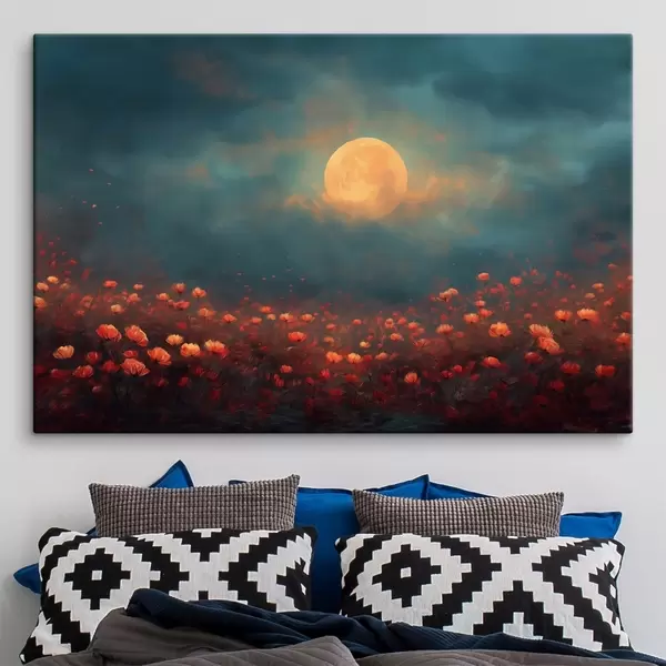 Cuadros Luna sobre un campo de flores rojas en un cielo brumoso al atardecer Nr s46167