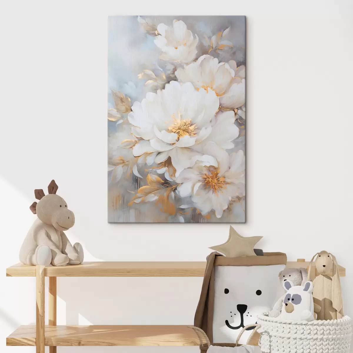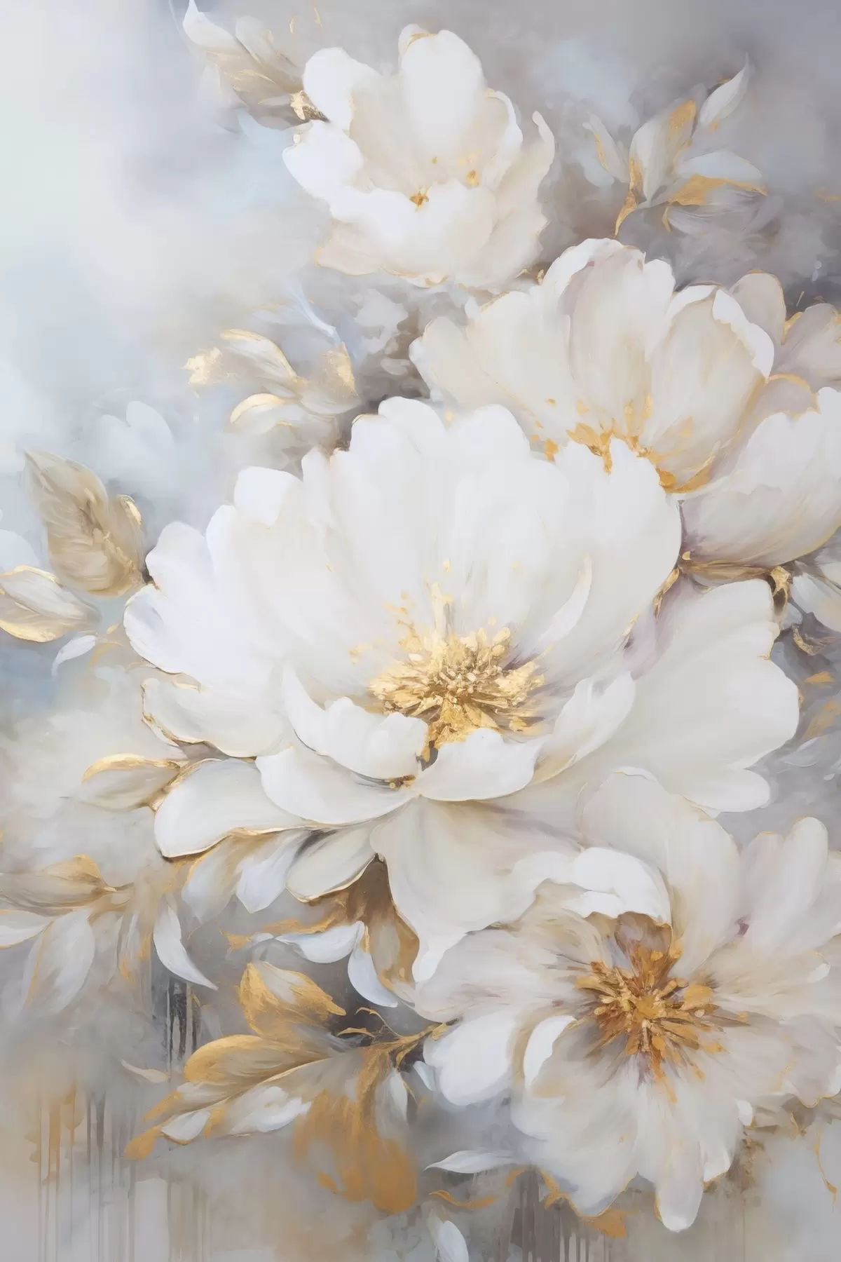 Cuadros Peonías blancas con centros y hojas amarillas, pinceladas suaves, fondo azul claro, arreglo floral Nr s46271