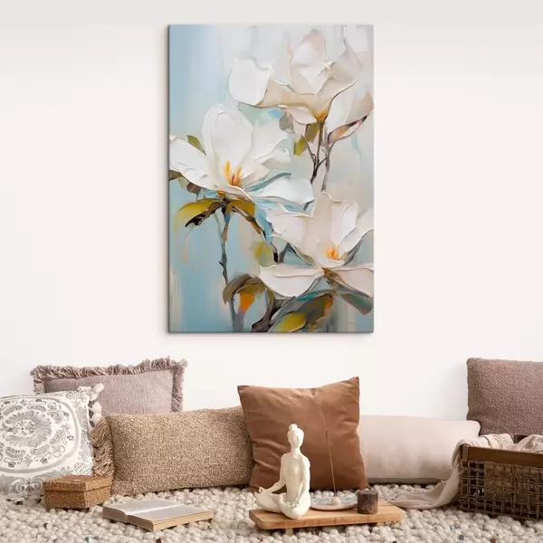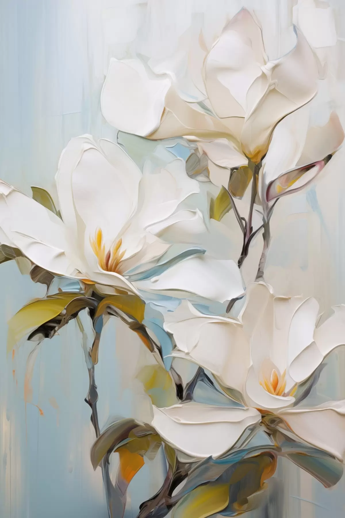 Cuadros Flores blancas de magnolia, fondo azul claro con suaves pinceladas, estilo pintura al óleo, textura impasto Nr s46276