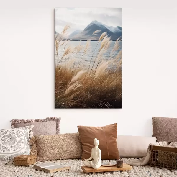 Cuadros Hierba de la pampa con un lago y montañas al fondo, iluminación suave, colores apagados, estilo naturalista Nr s46283