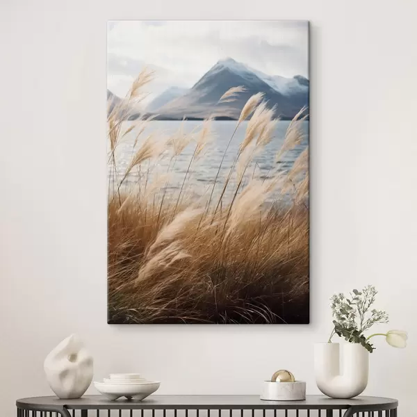 Cuadros Hierba de la pampa con un lago y montañas al fondo, iluminación suave, colores apagados, estilo naturalista Nr s46283