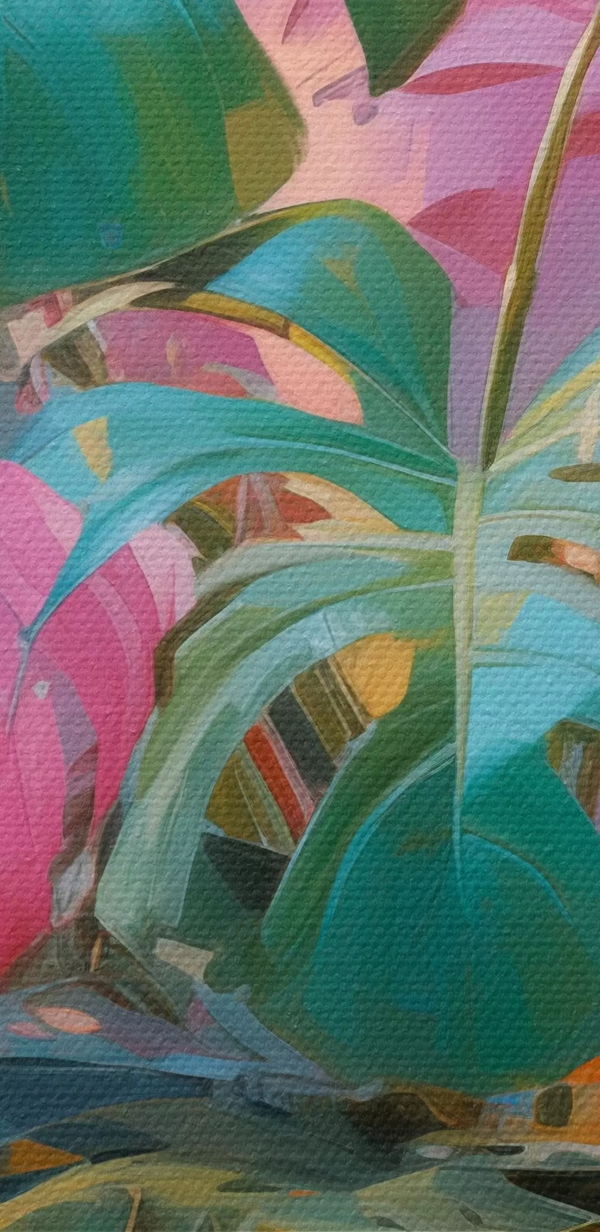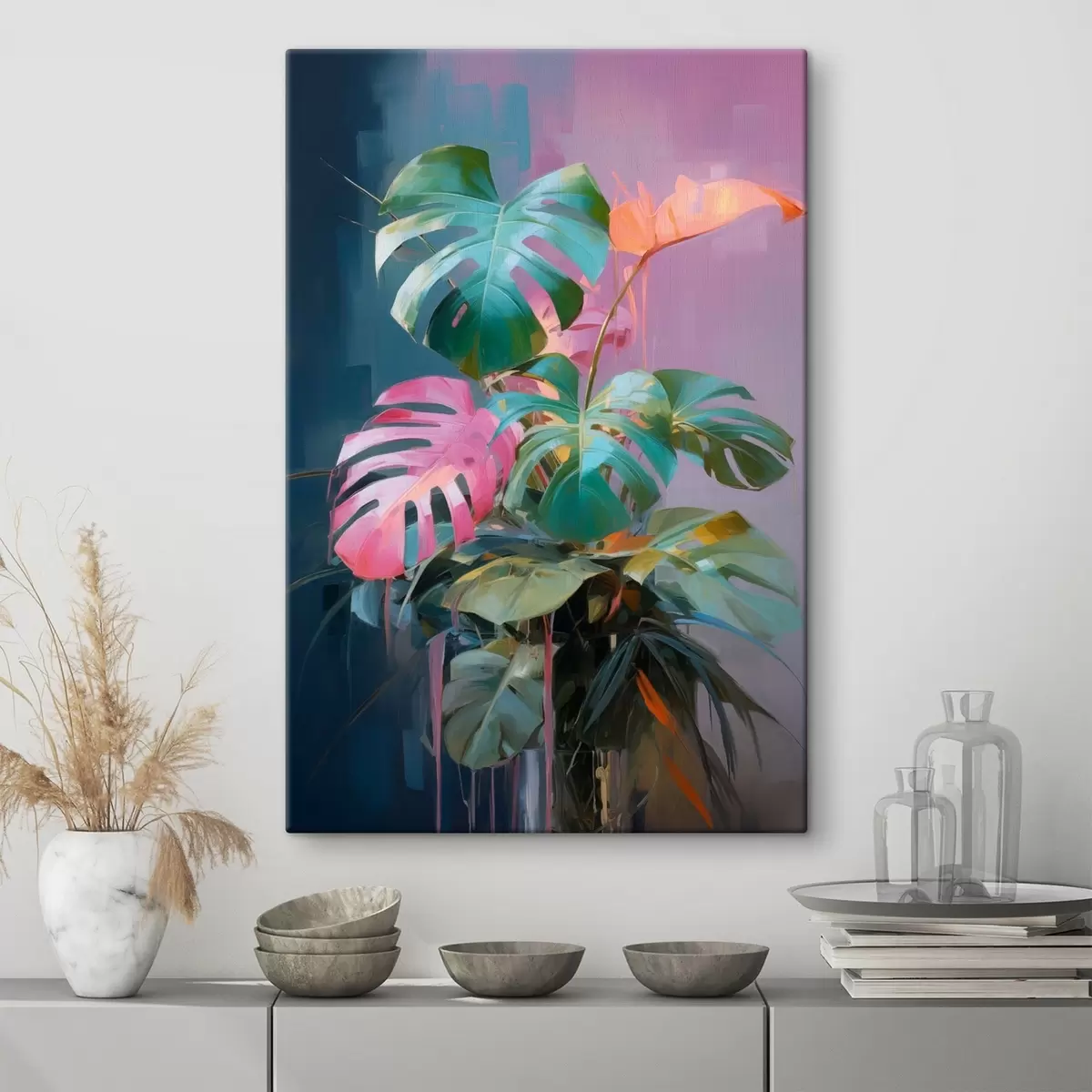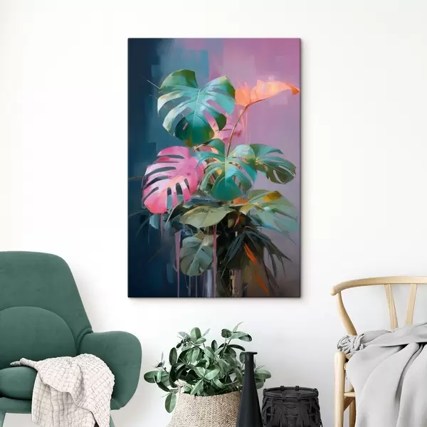 Cuadros Planta monstera abstracta con hojas rosas y verdes, colores vibrantes, sobre un fondo difuminado Nr s46287