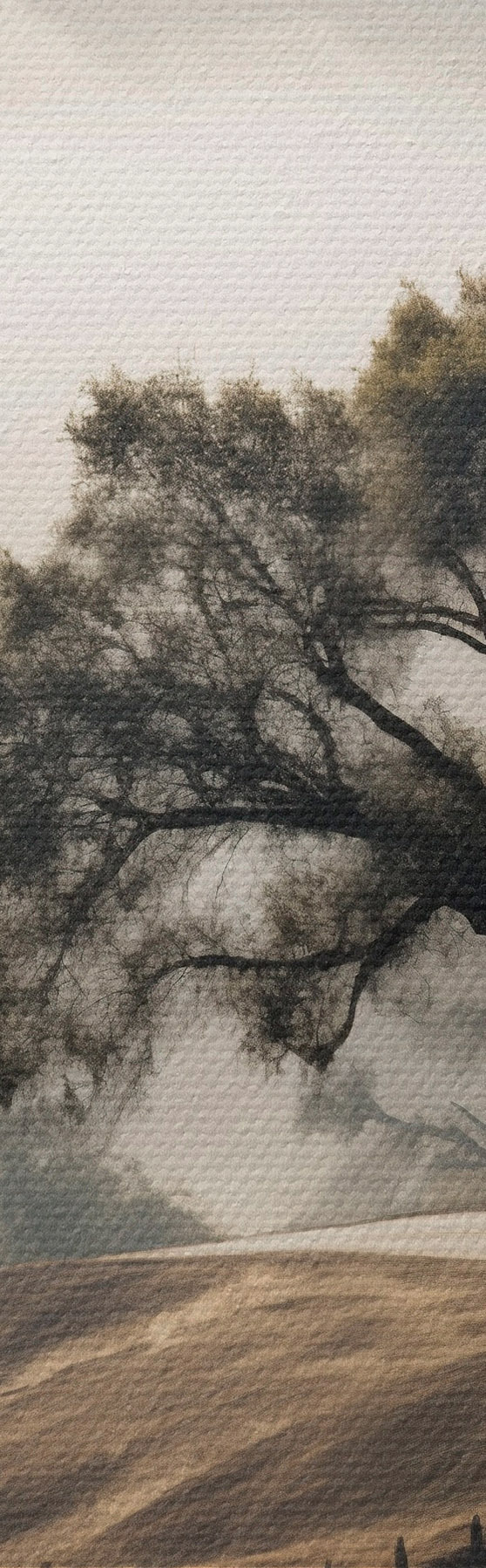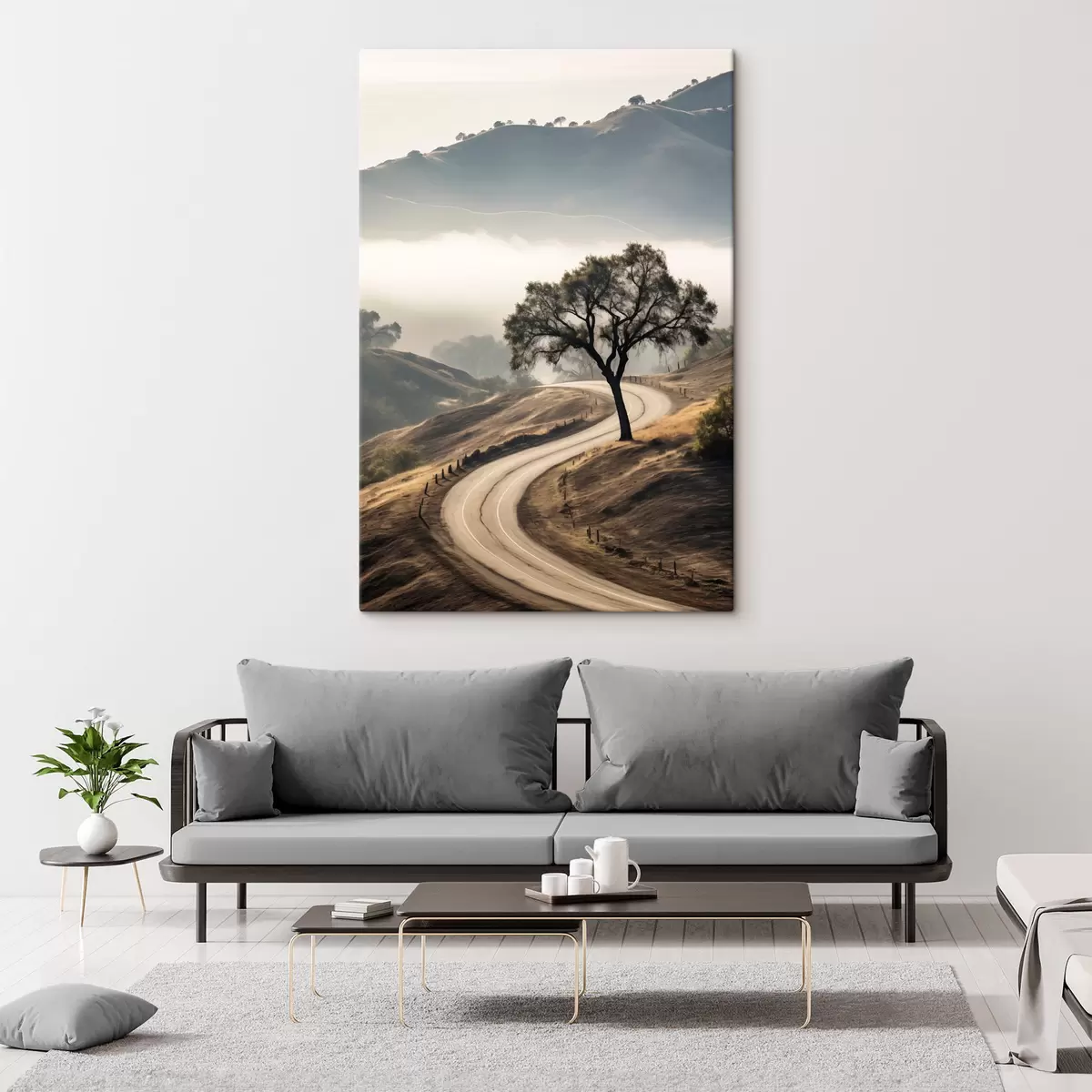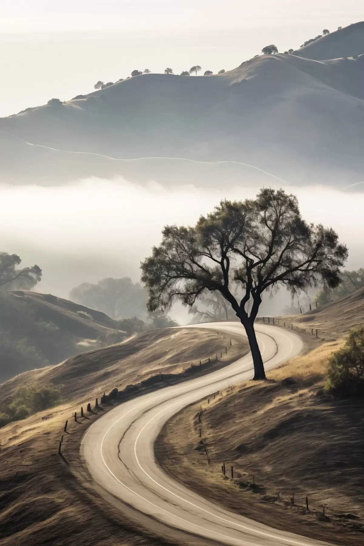 Cuadros Una carretera sinuosa que atraviesa colinas onduladas con un árbol en primer plano, y un fondo con niebla y montañas Nr s46288
