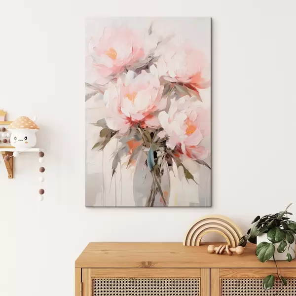 Cuadros Un ramo de peonías rosas y blancas en un jarrón de cristal, pinceladas suaves, colores pastel, fondo neutro. Nr s46295