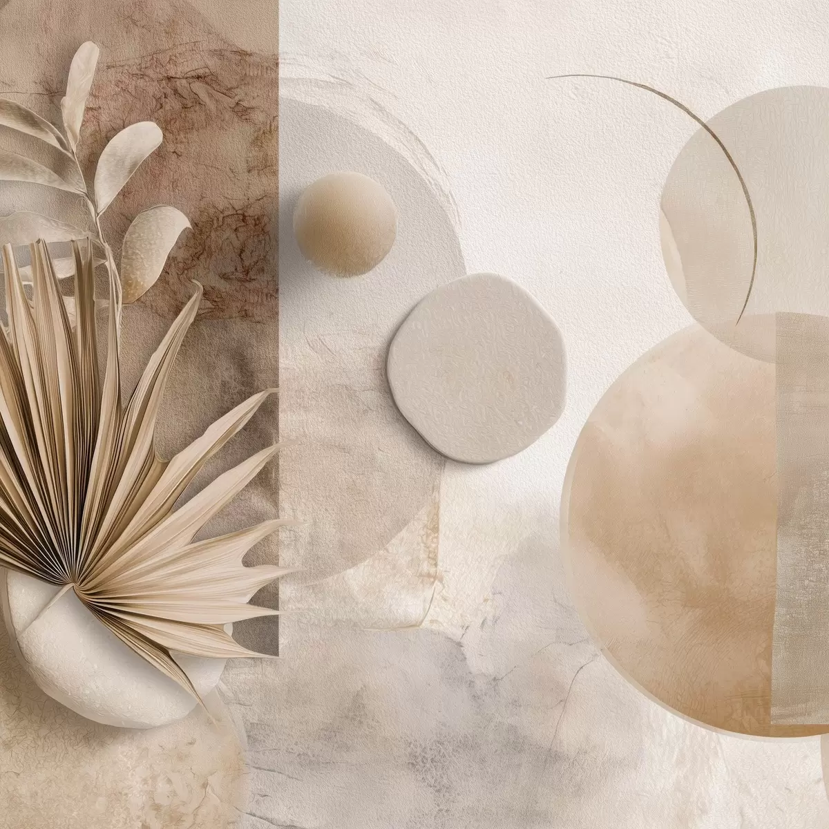 murales de pared Hojas de palmera secas y círculos 3D en tonos beige s46310
