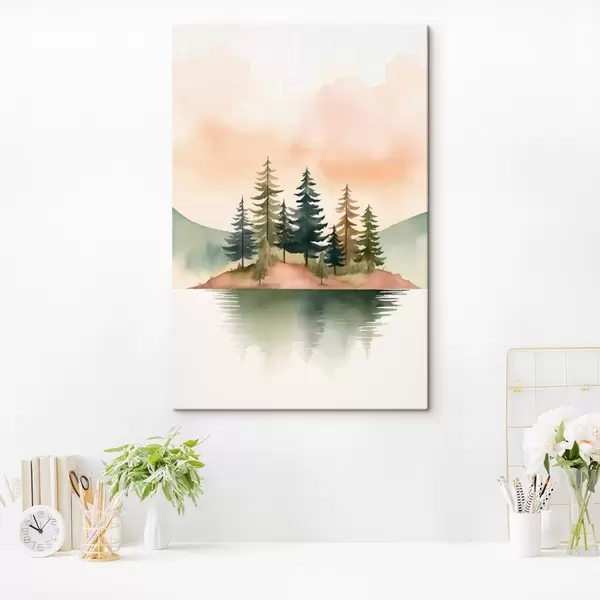 Cuadros Pinos acuarelados en un islote brumoso, cielo suave color melocotón. Nr s46505