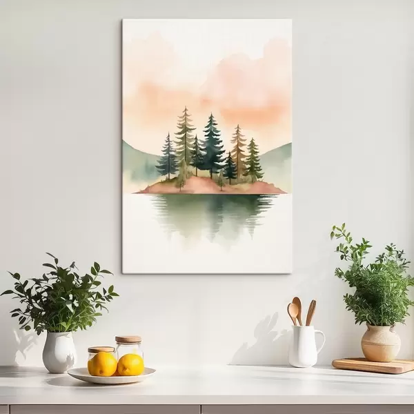 Cuadros Pinos acuarelados en un islote brumoso, cielo suave color melocotón. Nr s46505