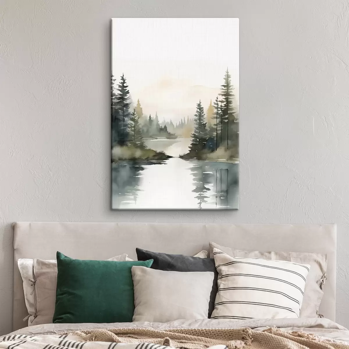 Cuadros Bosque brumoso de coníferas sobre un río tranquilo, estilo acuarela. Nr s46507