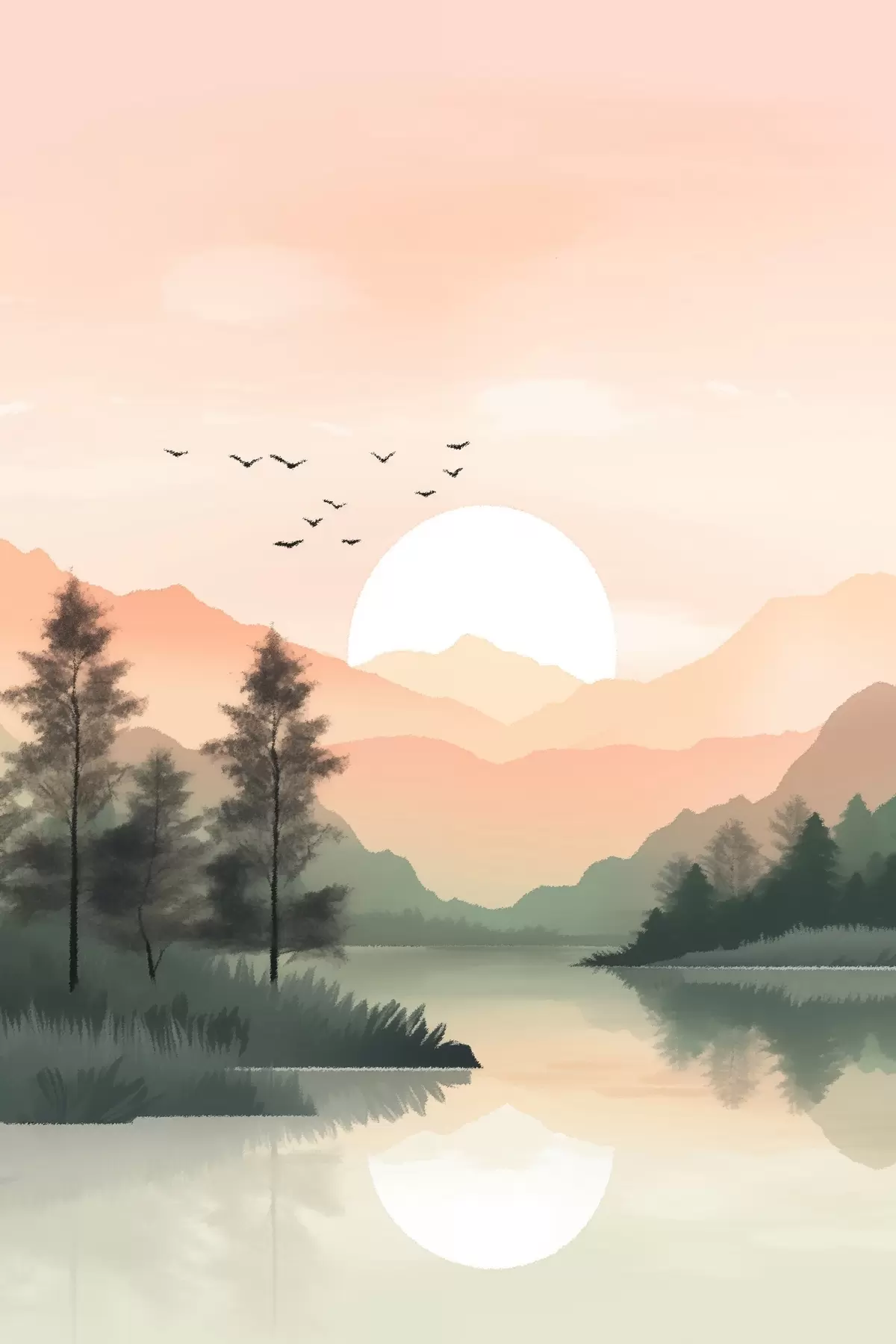 murales de pared Puesta de sol en tonos pastel sobre un lago tranquilo con colinas lejanas y pájaros. s46508