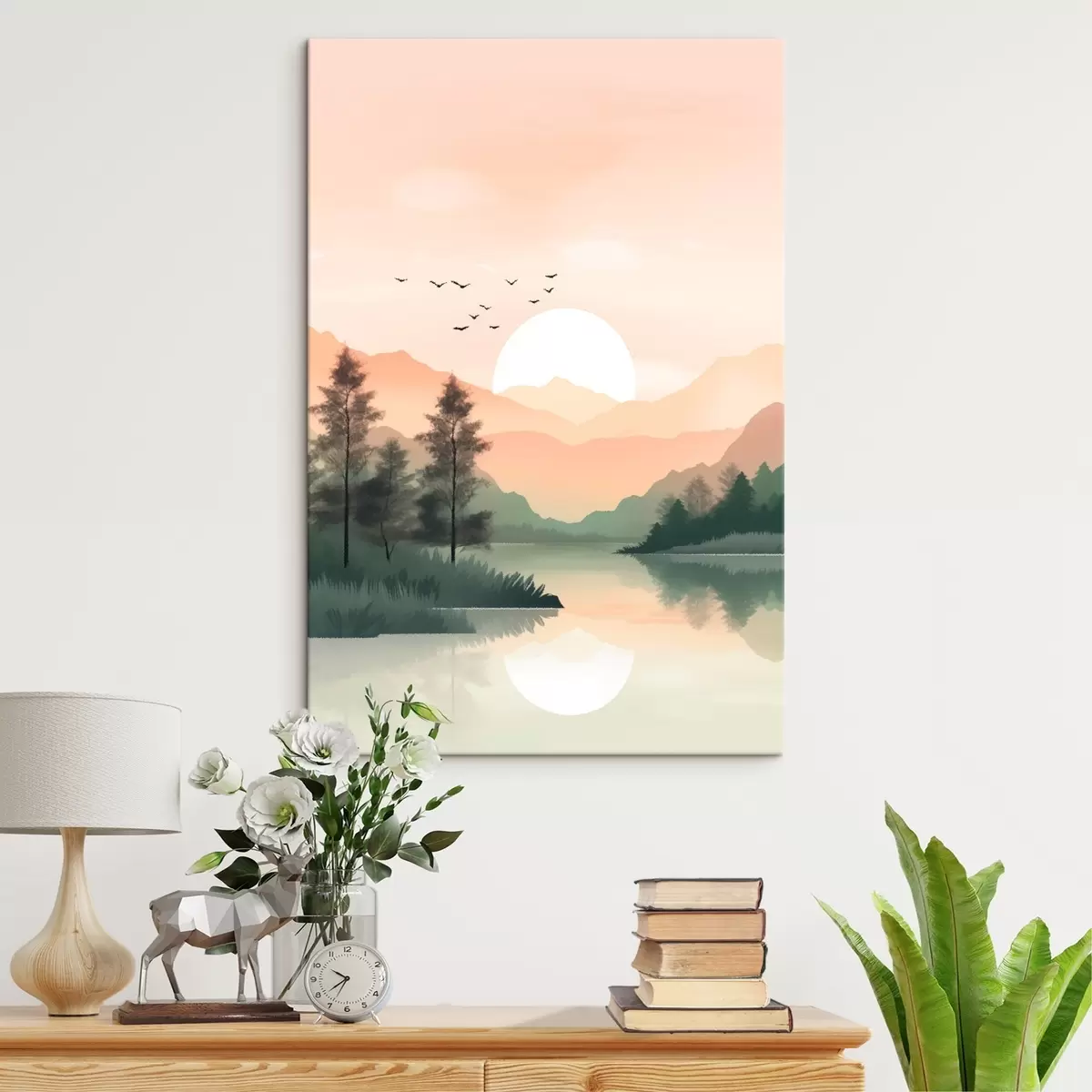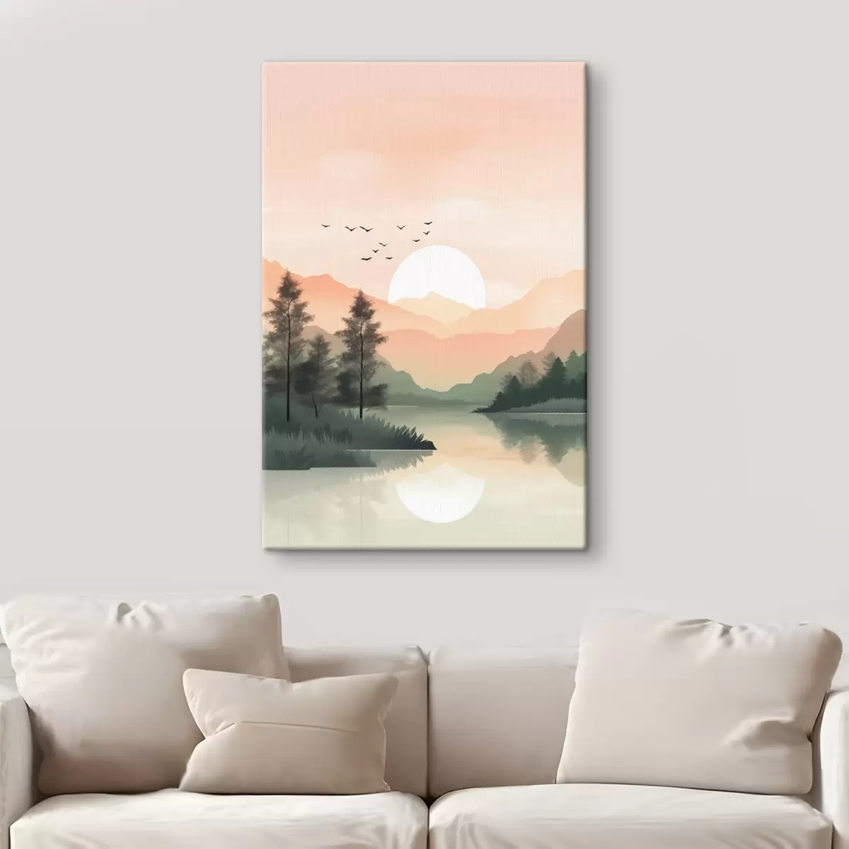 Cuadros Puesta de sol en tonos pastel sobre un lago tranquilo con colinas lejanas y pájaros. Nr s46508