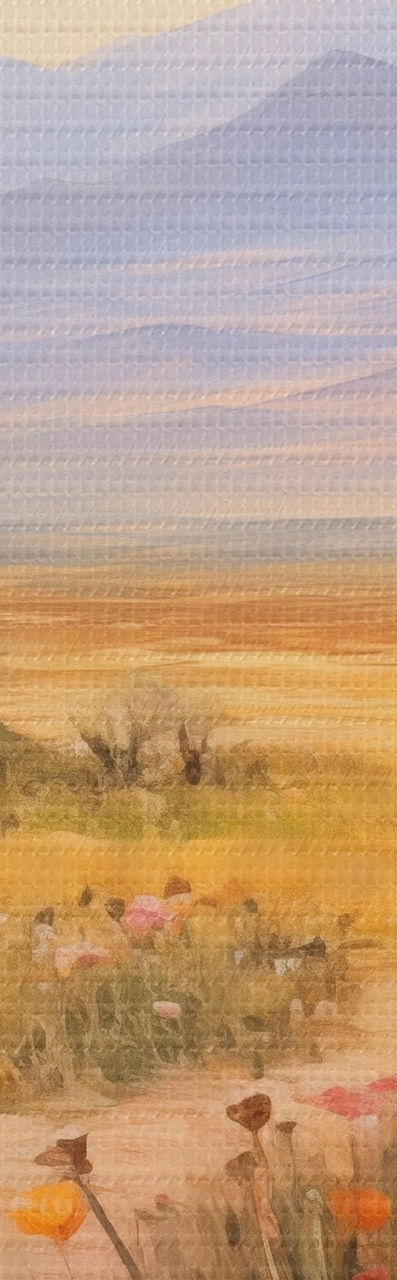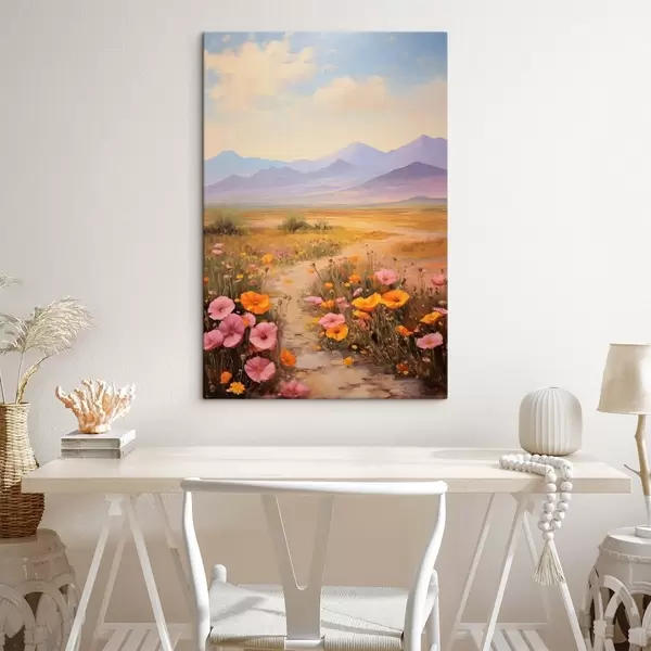 Cuadros Paisaje, un campo de flores coloridas con montañas al fondo, colores suaves y pastel. Nr s46686